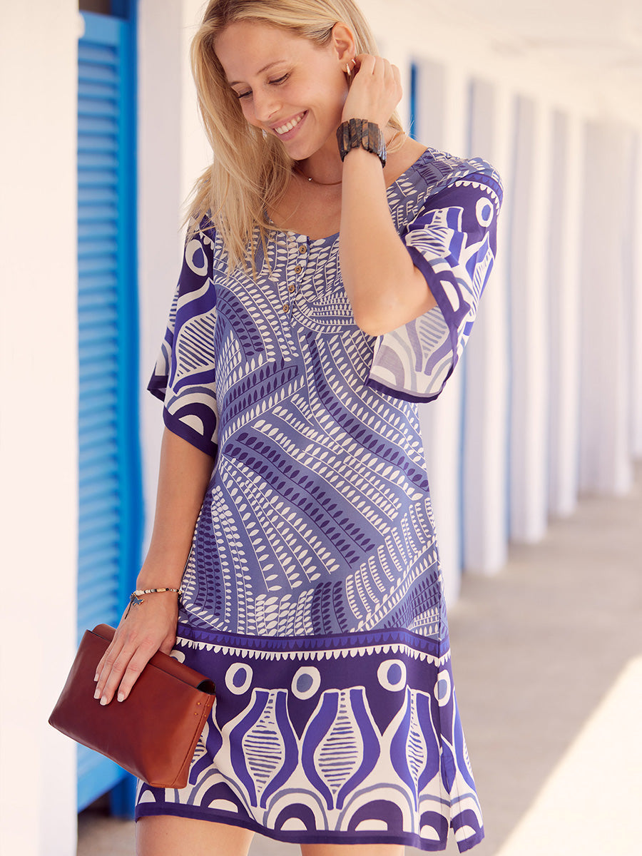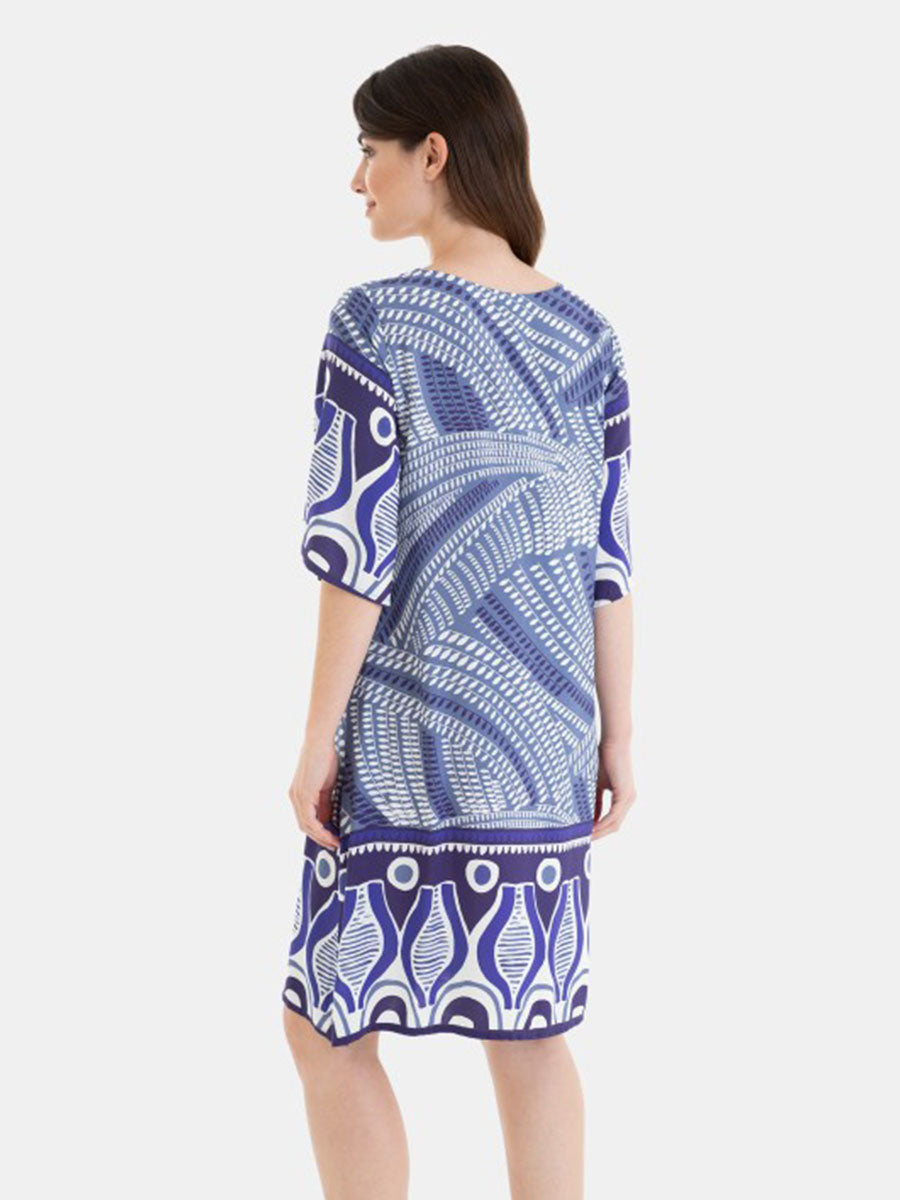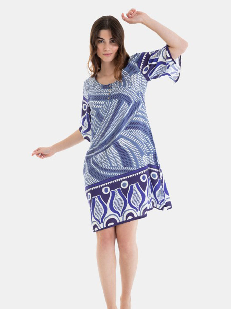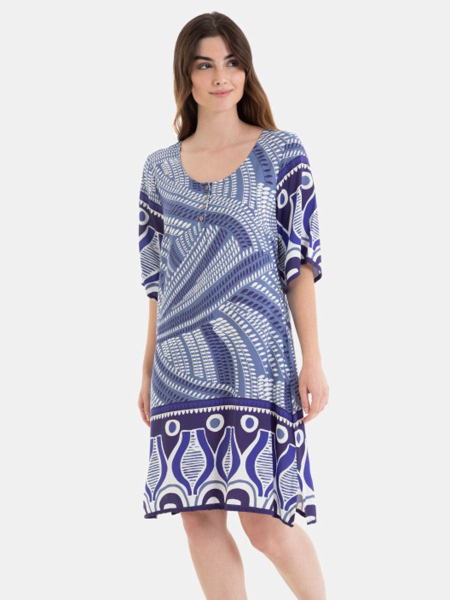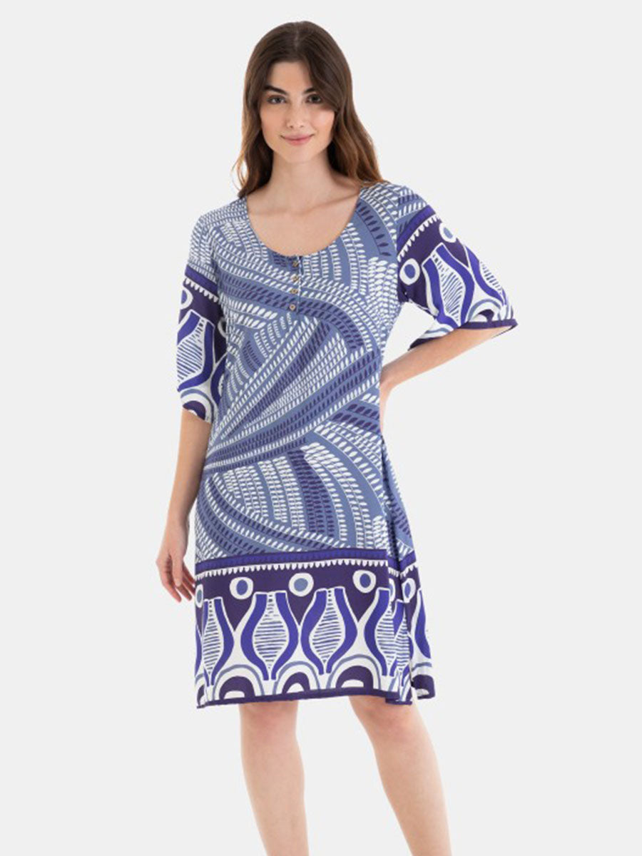 Vestido de mujer en tejido de tela de viscosa, de manga francesa 3/4 con detalle de abertura, cuello redondo acabado en abertura con botones.
