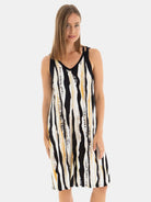 Vestido de mujer en tejido de punto viscosa estampado, escote en "V" y fantasía de doble tirante