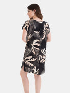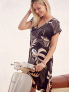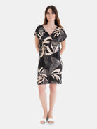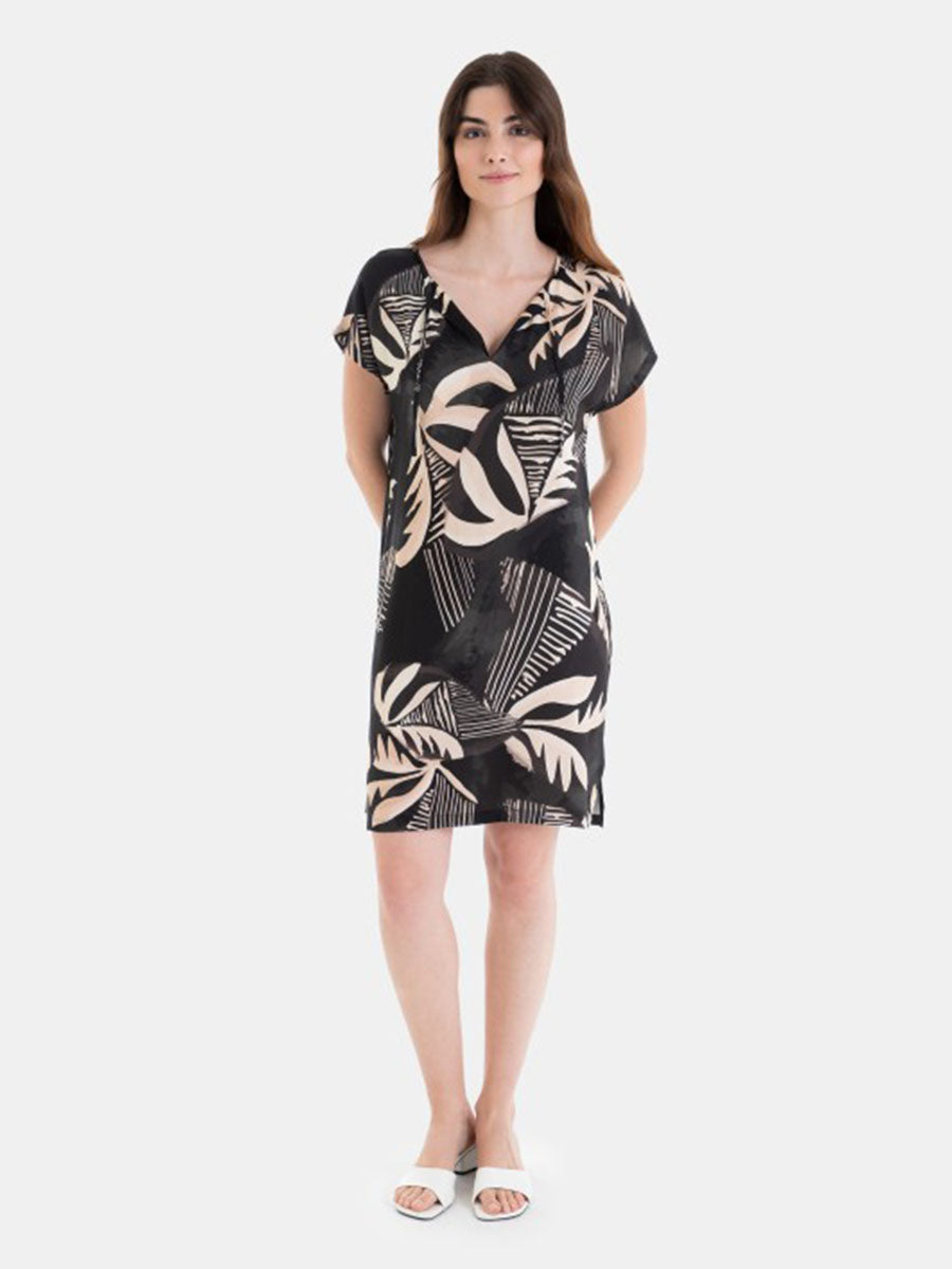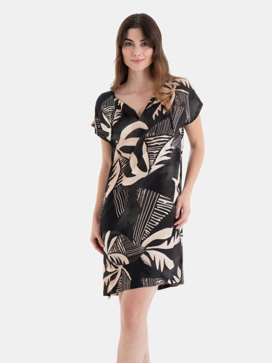Vestido de mujer largo en tejido de viscosa plana estampado, de hombro caído, escote en"V" y aberturas en bajo laterales