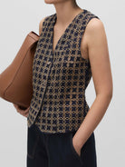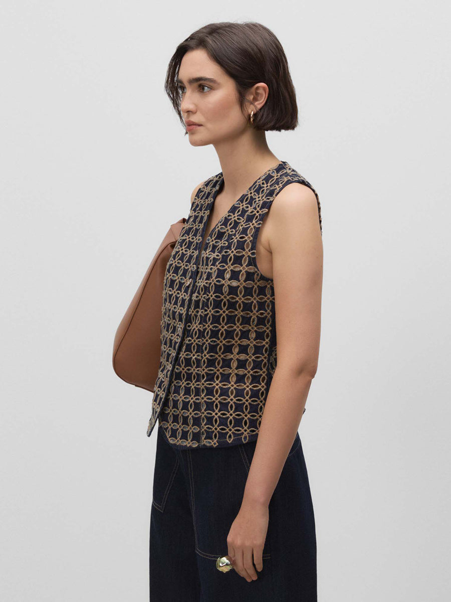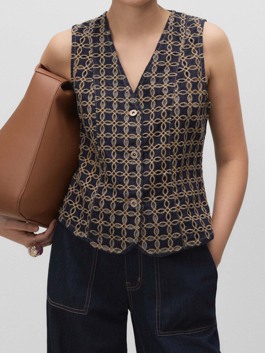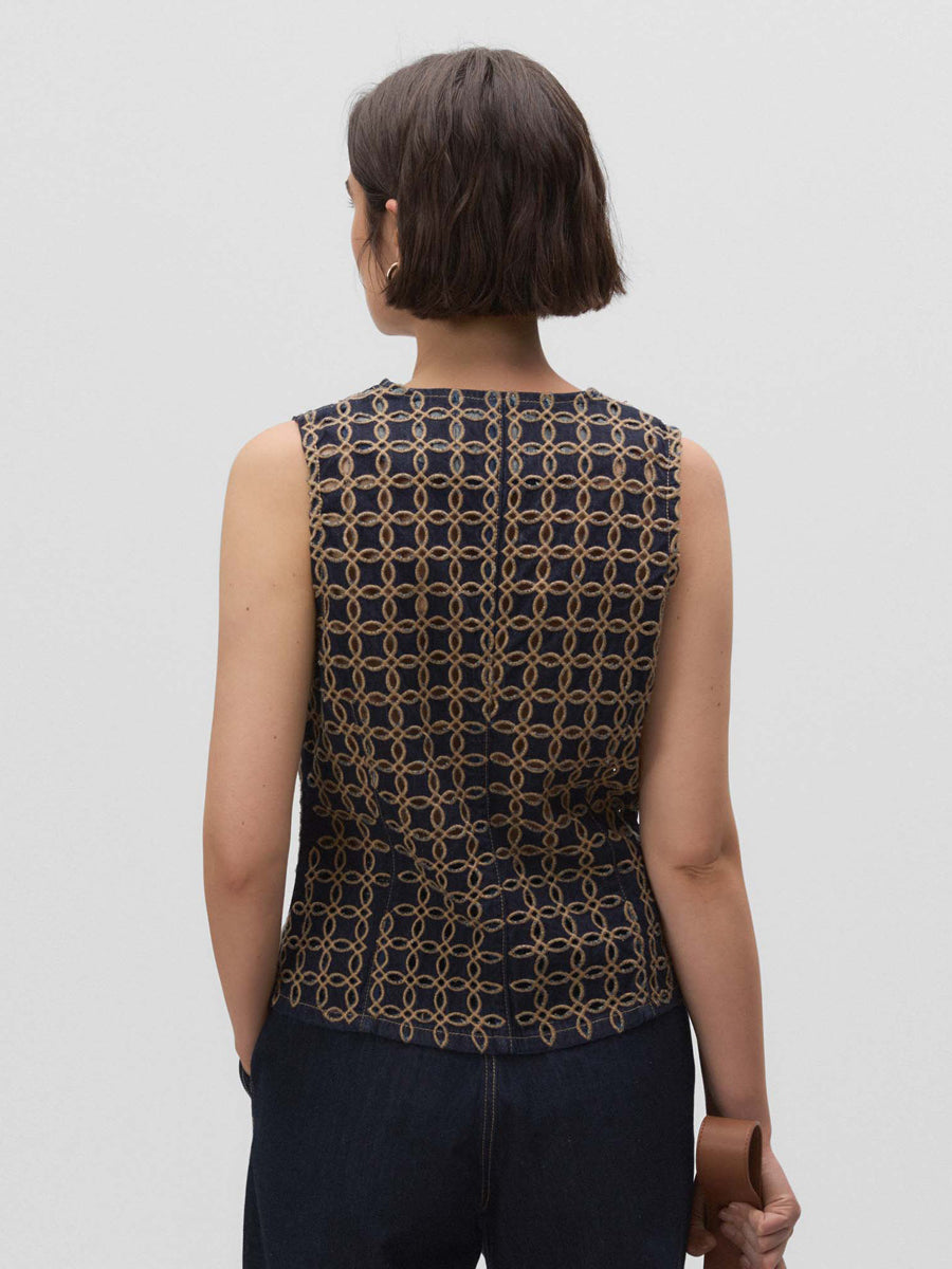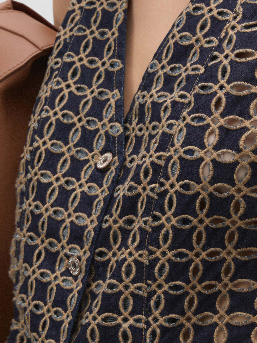 Chaleco tejano con bordado inglés a contraste. Cierre mediante botones metálicos.