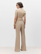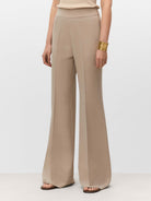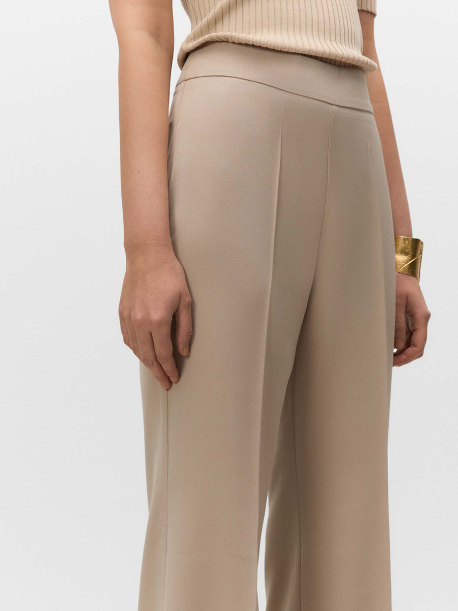 Pantalón acampanado con cinturilla ancha. Cierre mediante cremallera invisible en el lateral.