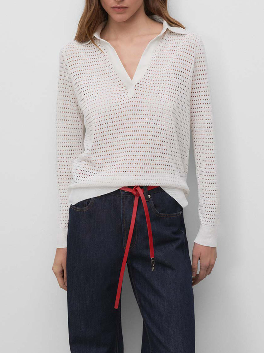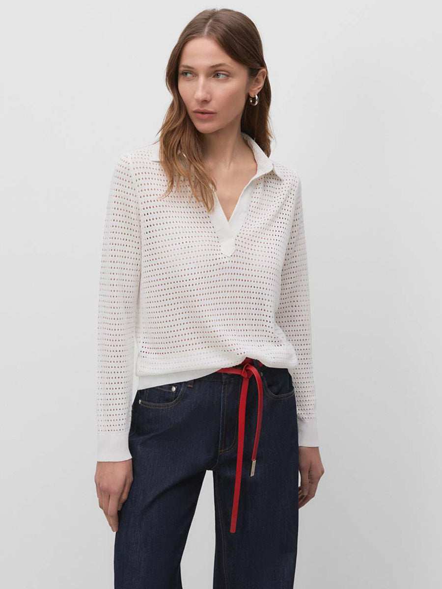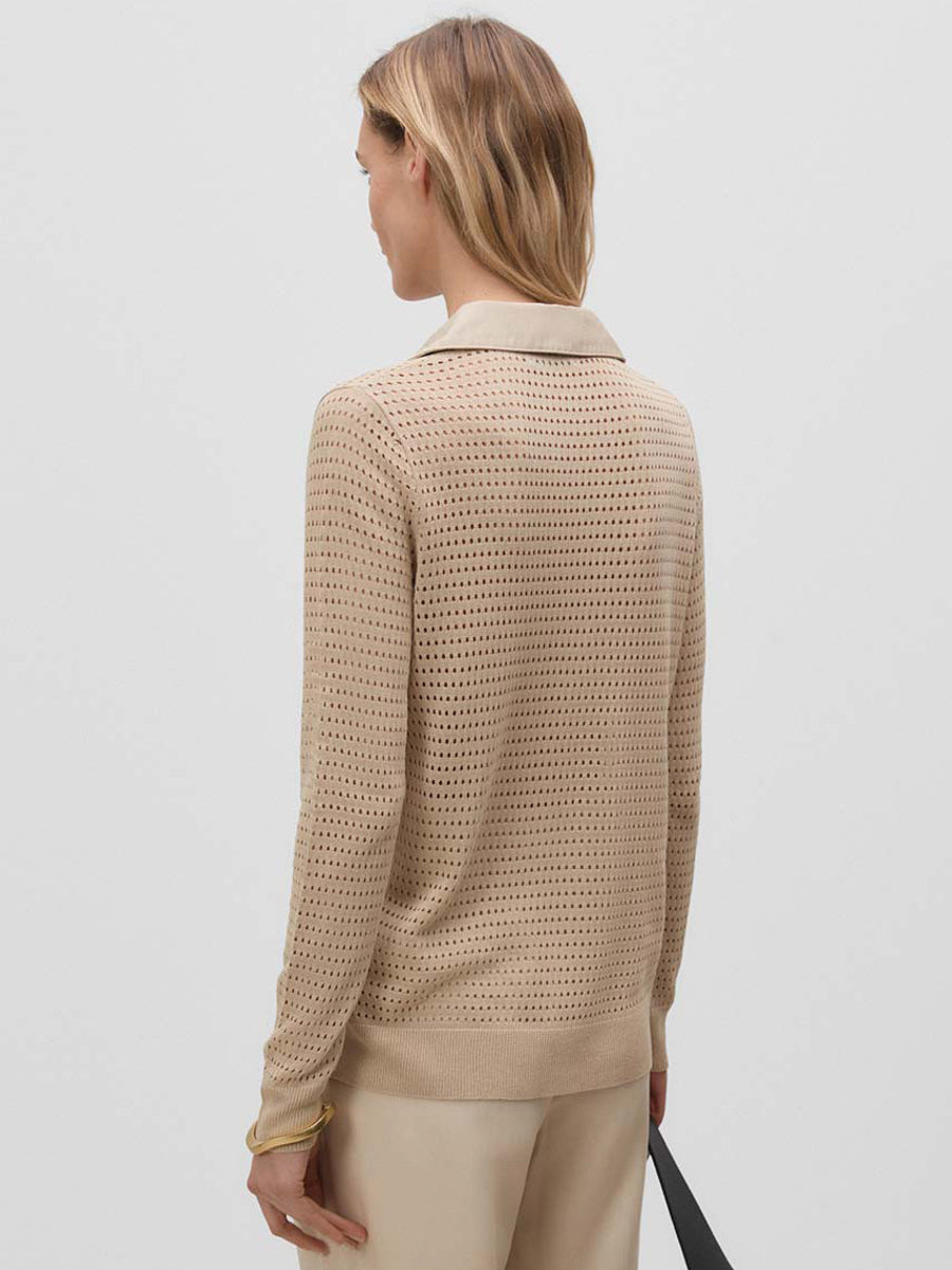 Jersey con calados y cuello tipo polo de tejido. Manga larga acabada en puños de canalé.