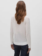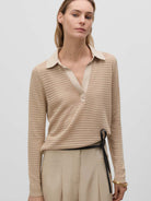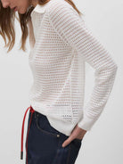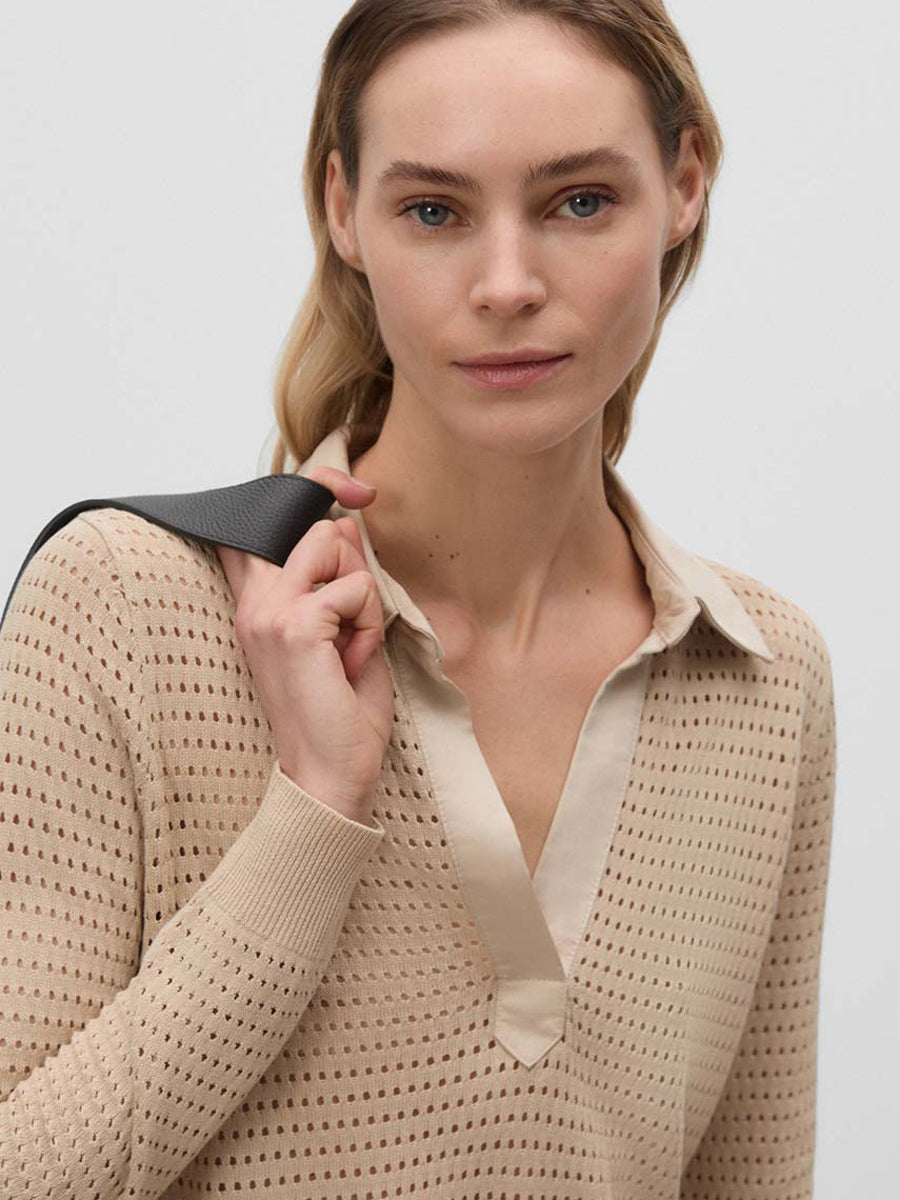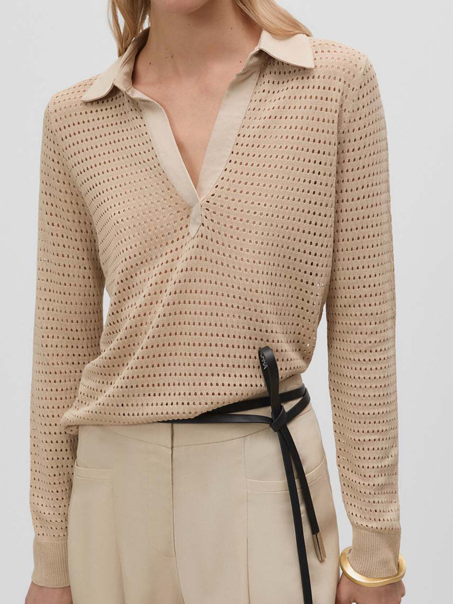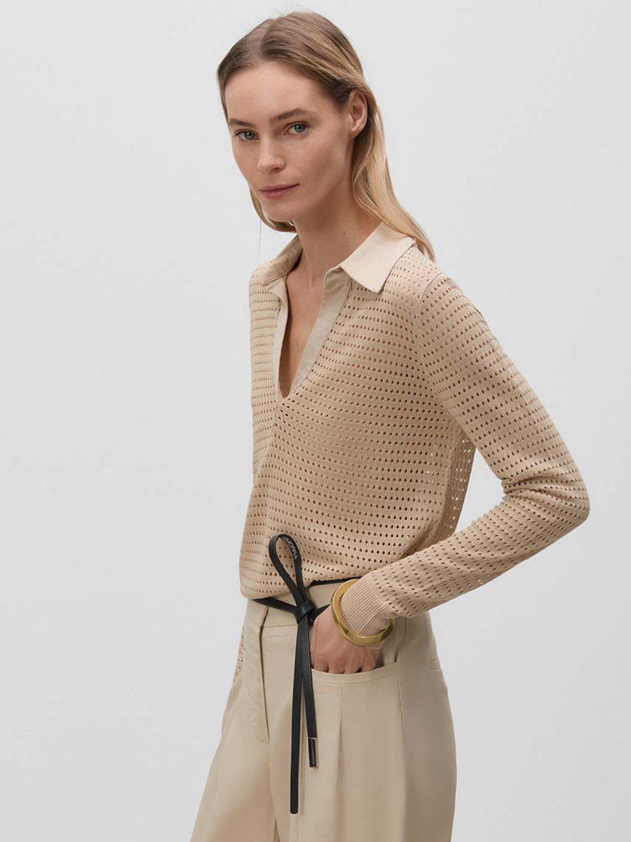 Jersey con calados y cuello tipo polo de tejido. Manga larga acabada en puños de canalé.