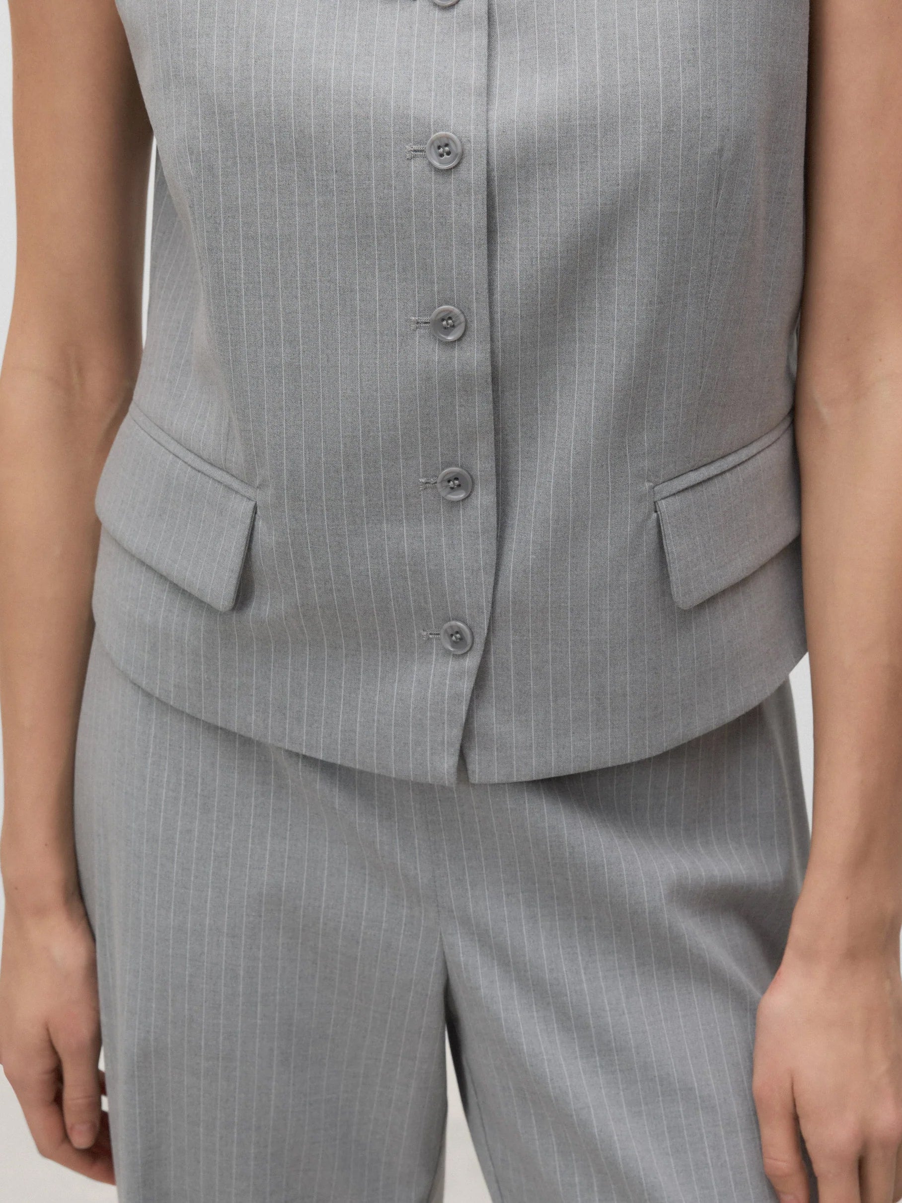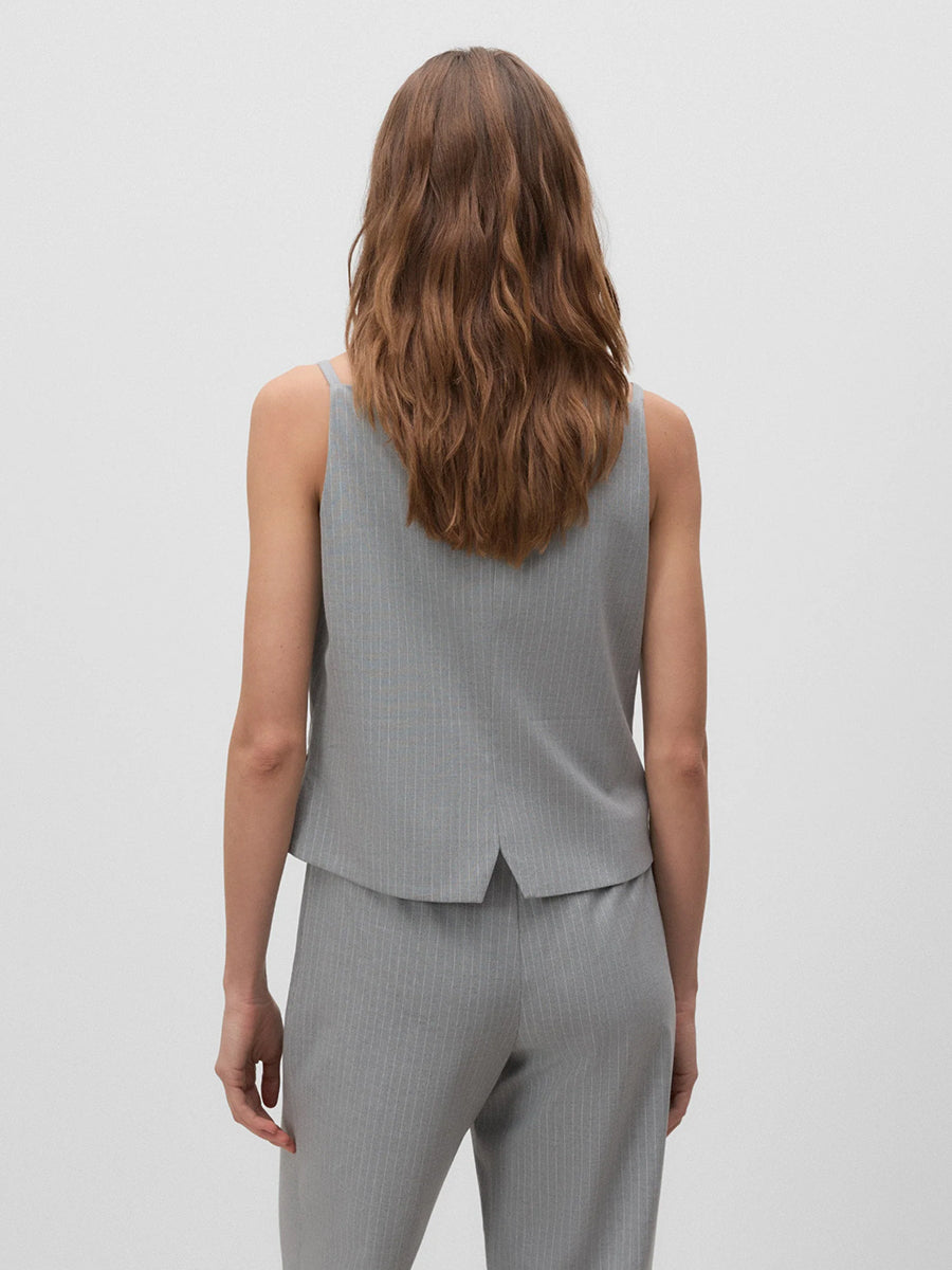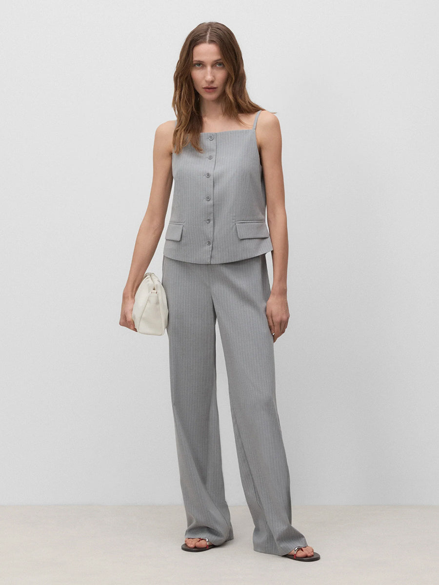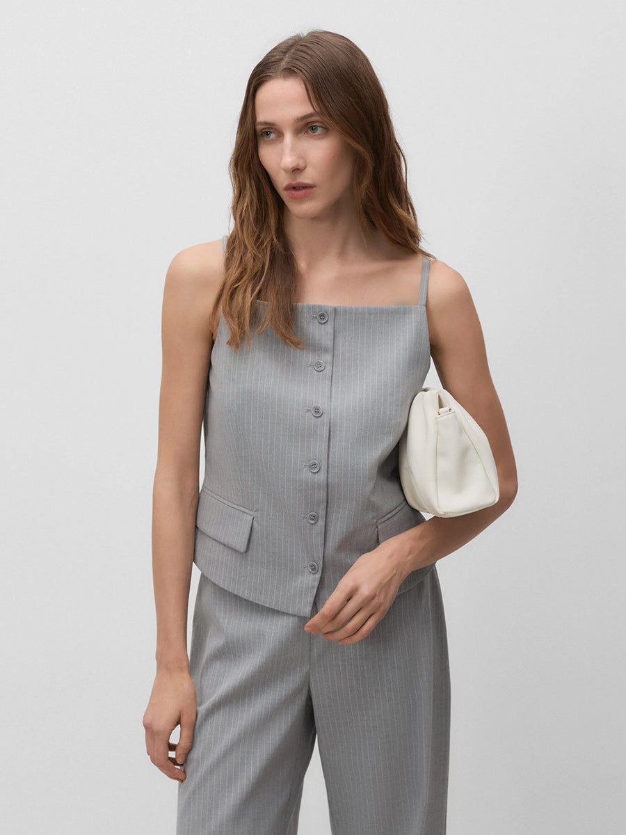 Top de raya diplomática de tirantes con escote cuadrado. Cierre mediante botonadura frontal. Bolsillos de plastrón. Abertura en la espalda.