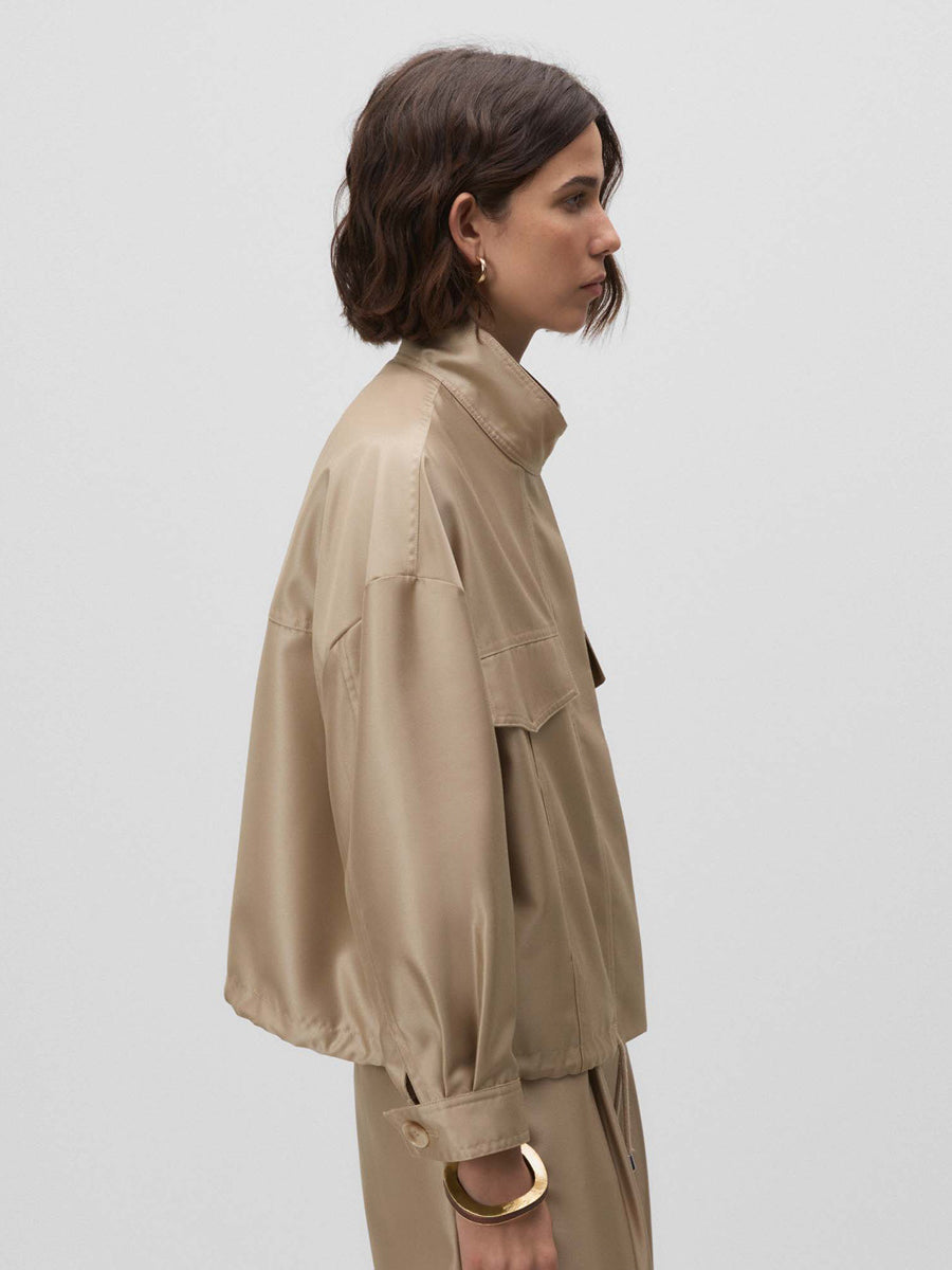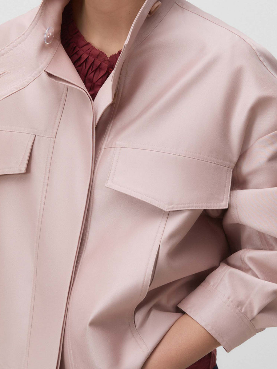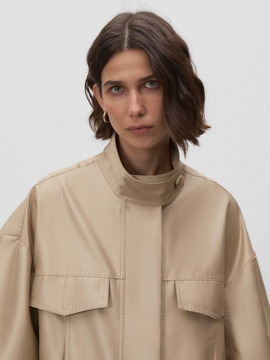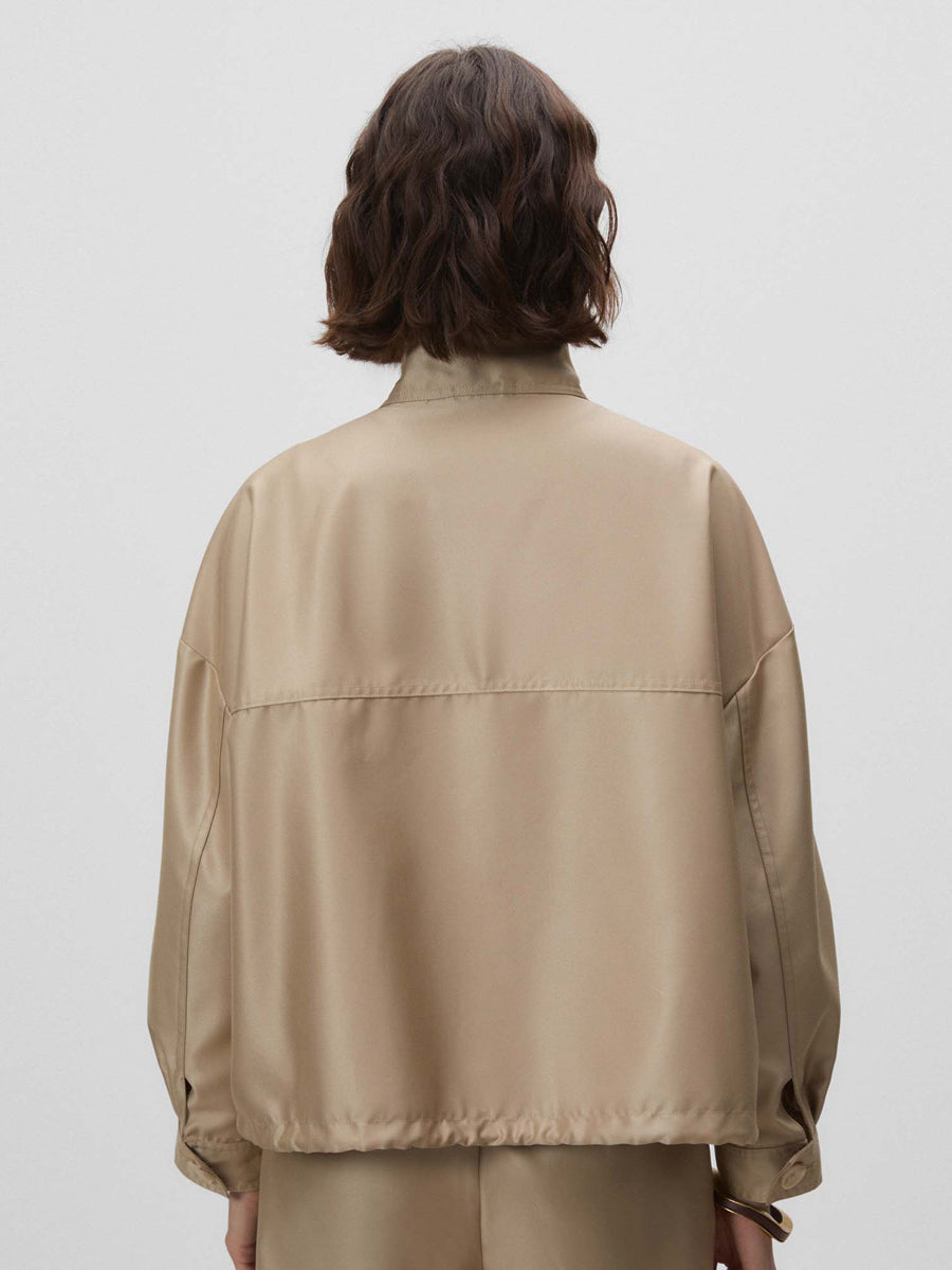 Chaqueta corta oversize de cuello alto. Cierre mediante botones ocultos por tapeta. Bolsillos de plastrón en el pecho y ocultos en costura. Bajo con regulador.