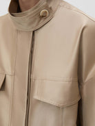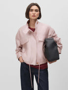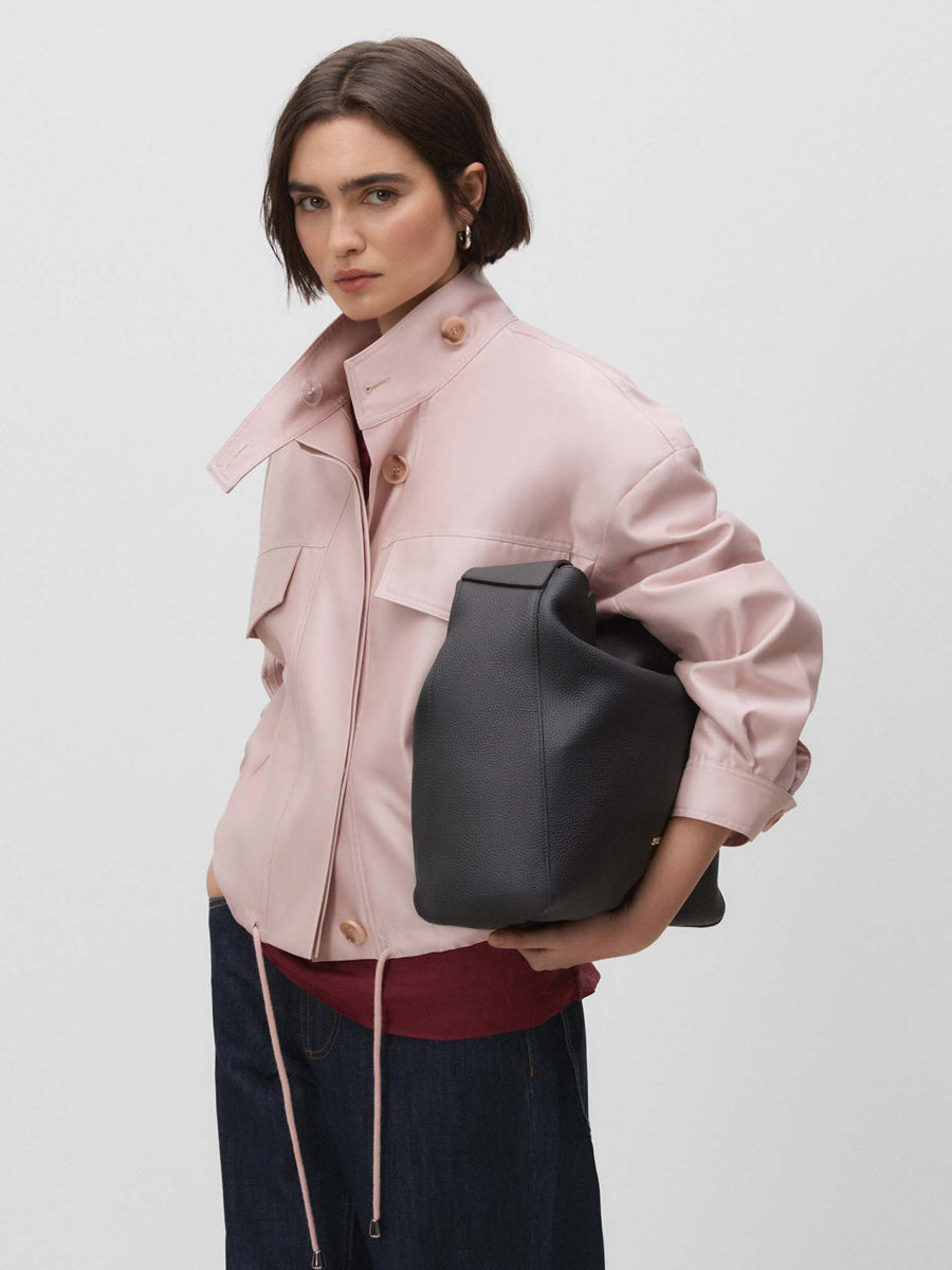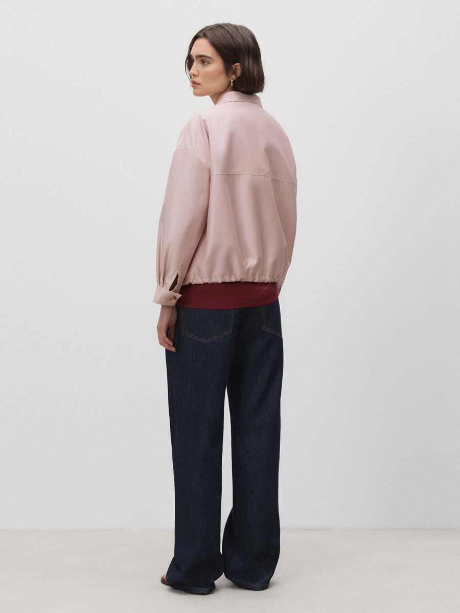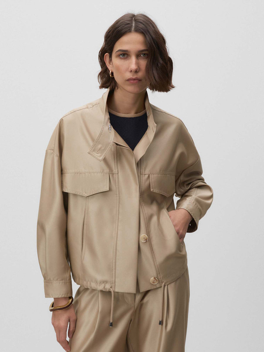 Chaqueta corta oversize de cuello alto. Cierre mediante botones ocultos por tapeta. Bolsillos de plastrón en el pecho y ocultos en costura. Bajo con regulador.