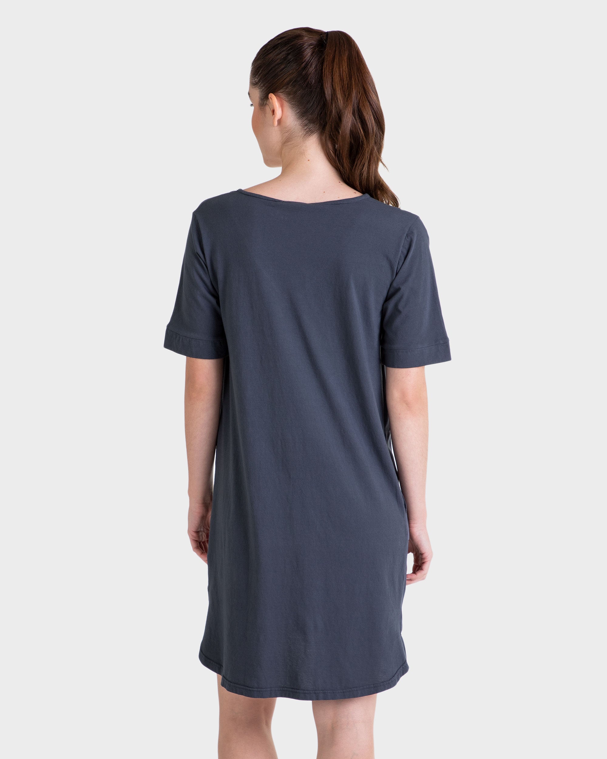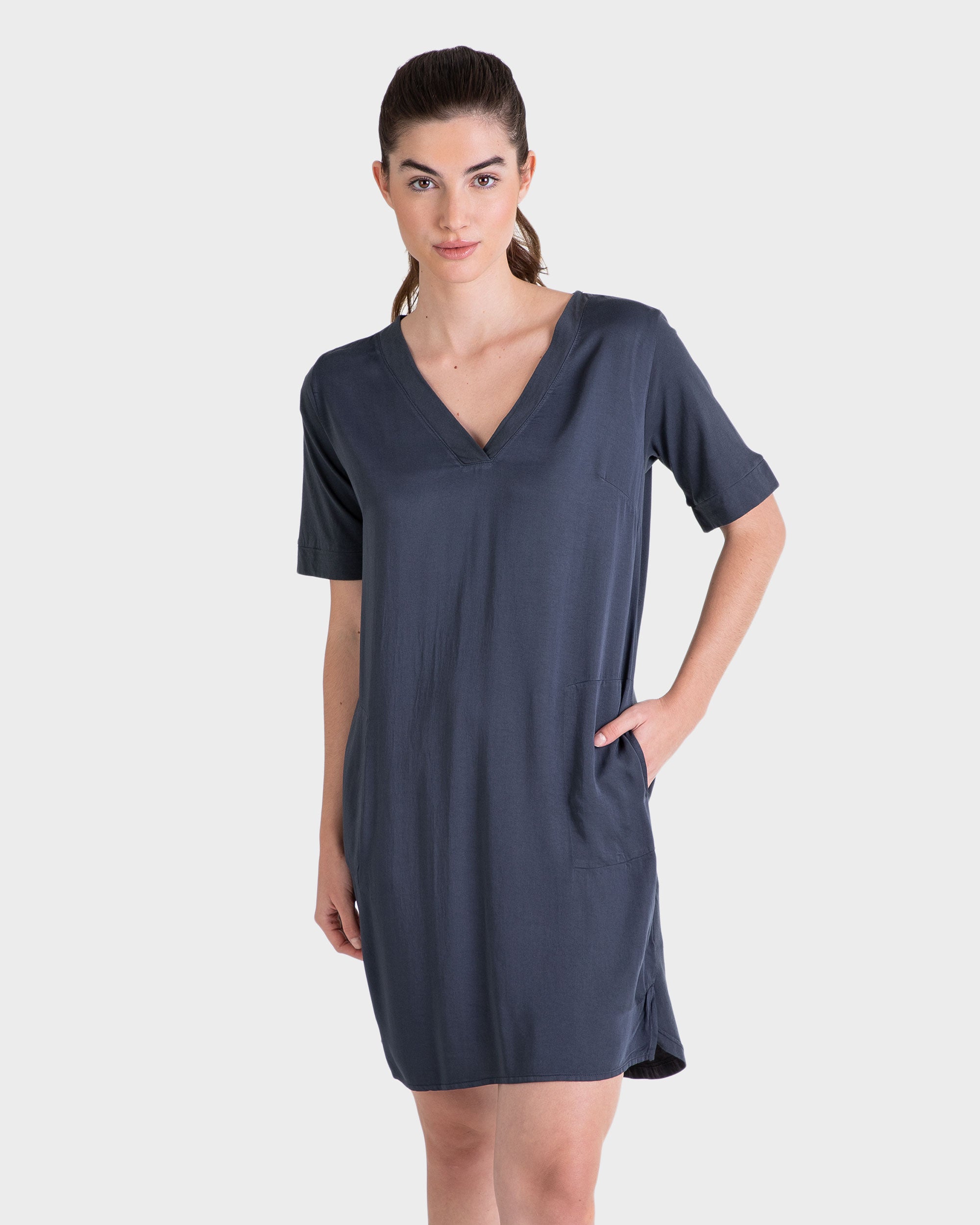 Vestido corto, color liso, manga corta, cuello en pico.