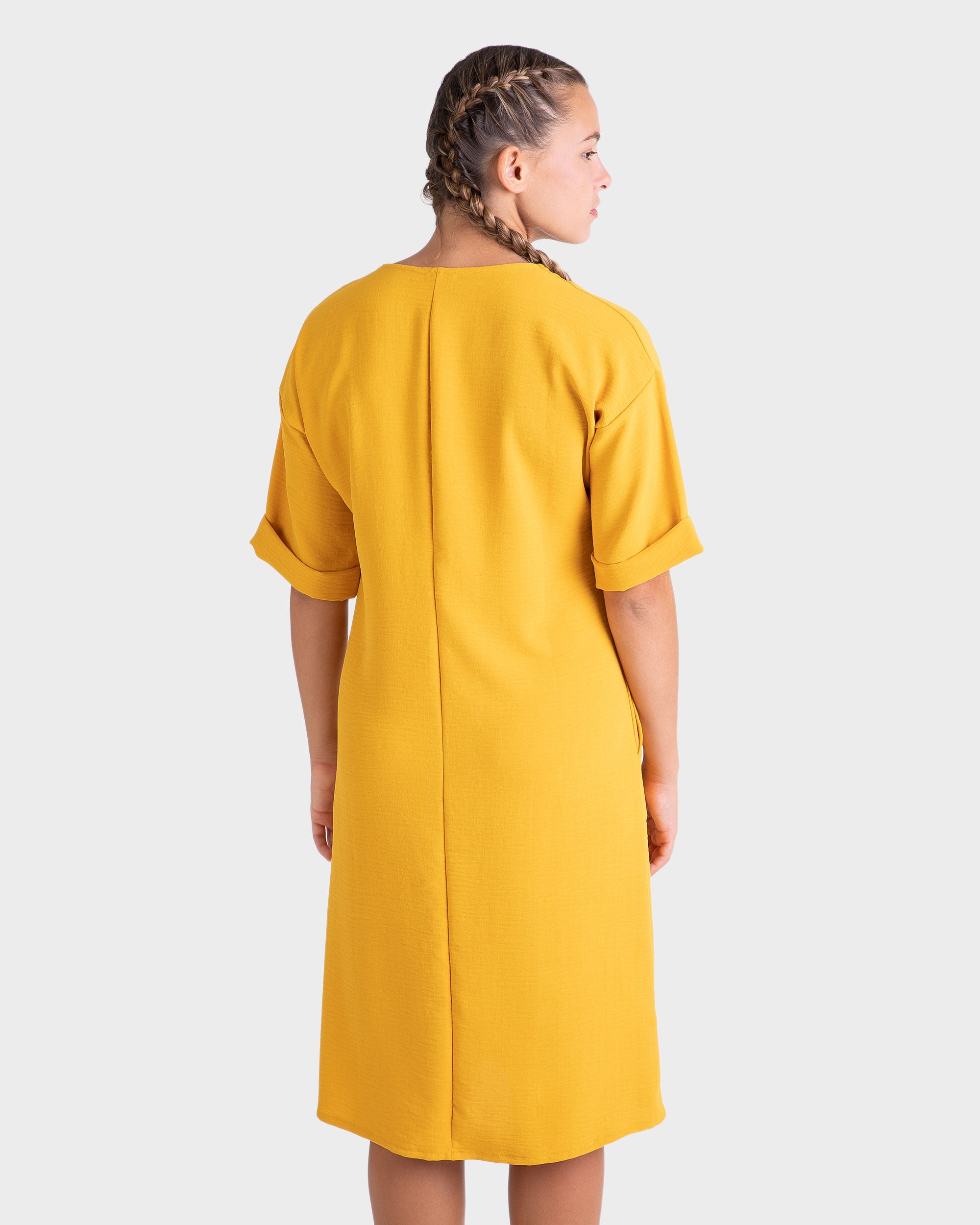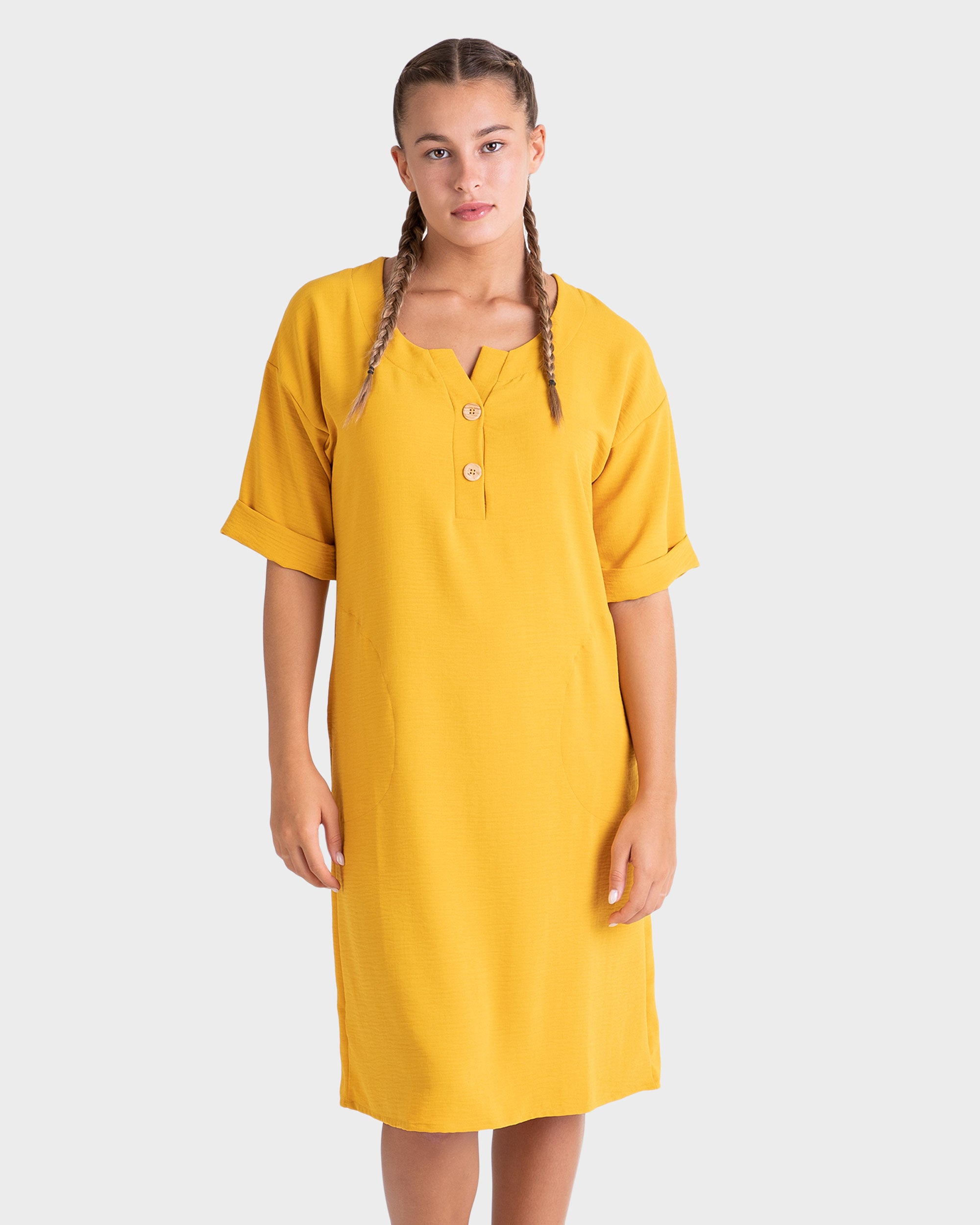 Vestido con mangas, cuello redondo, detalle de botones delanteros.