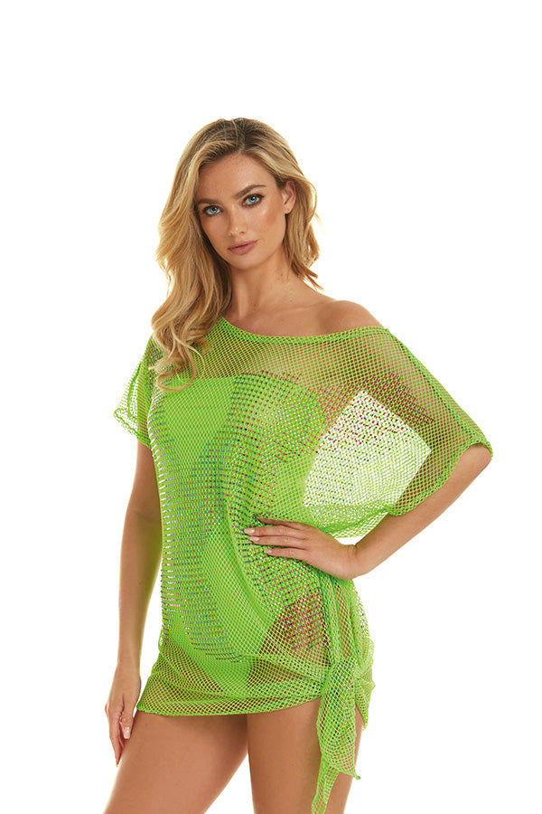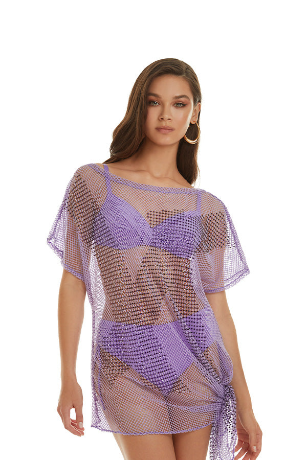 Vestido transparente tipo malla, con detalles de lurex, manga corta.