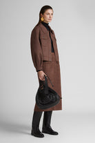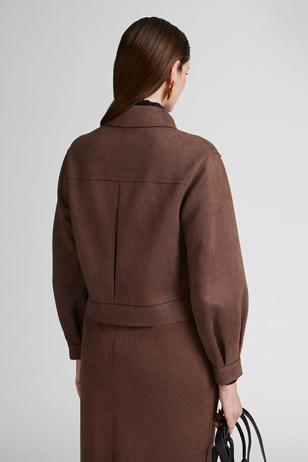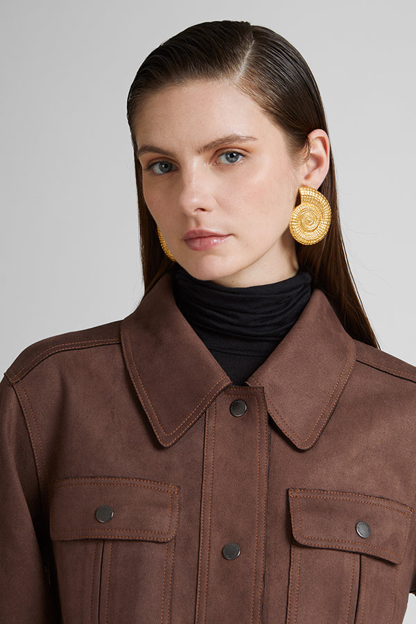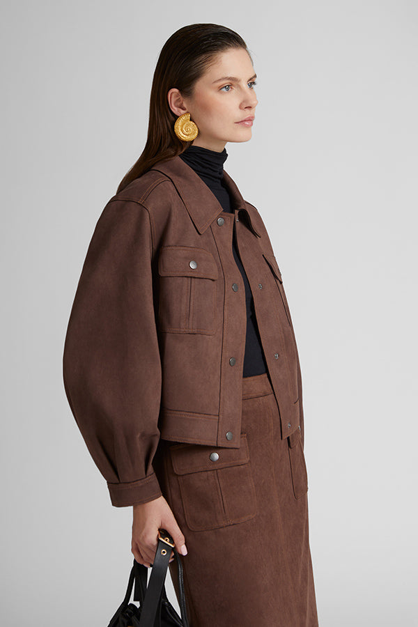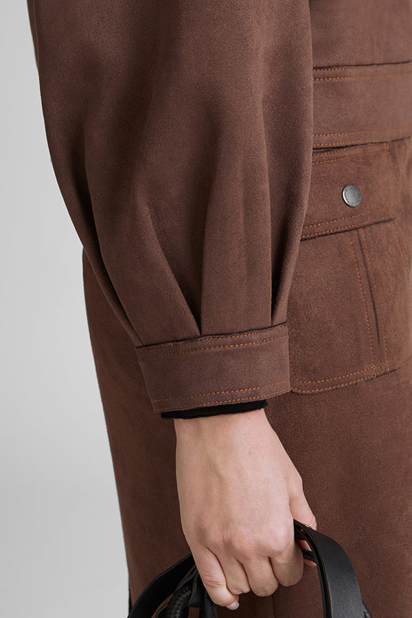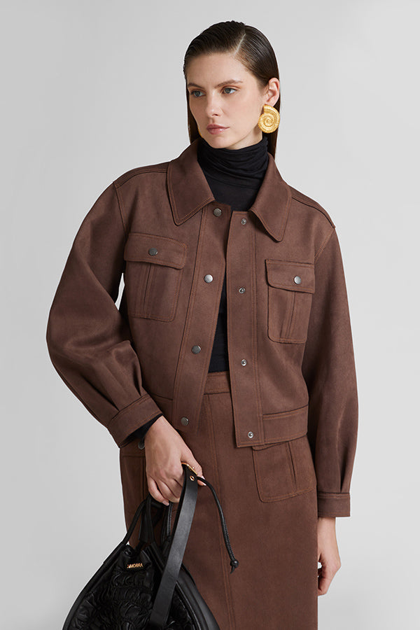 Chaqueta de antelina con cuello camisero. Bolsillos de parche con solapa en el pecho. Cierre mediante botonadura frontal. Manga abullonada con puños abotonados.