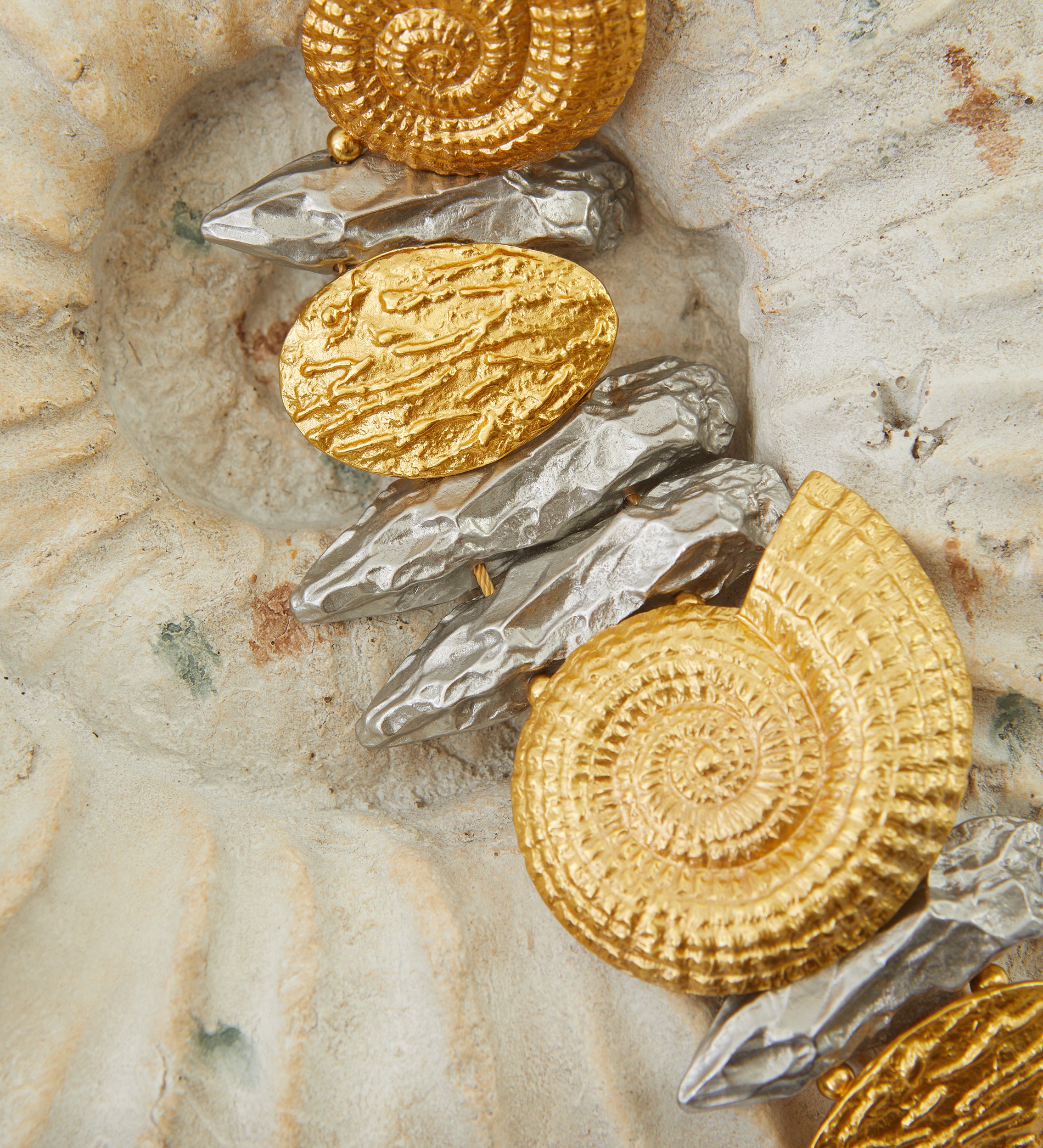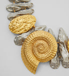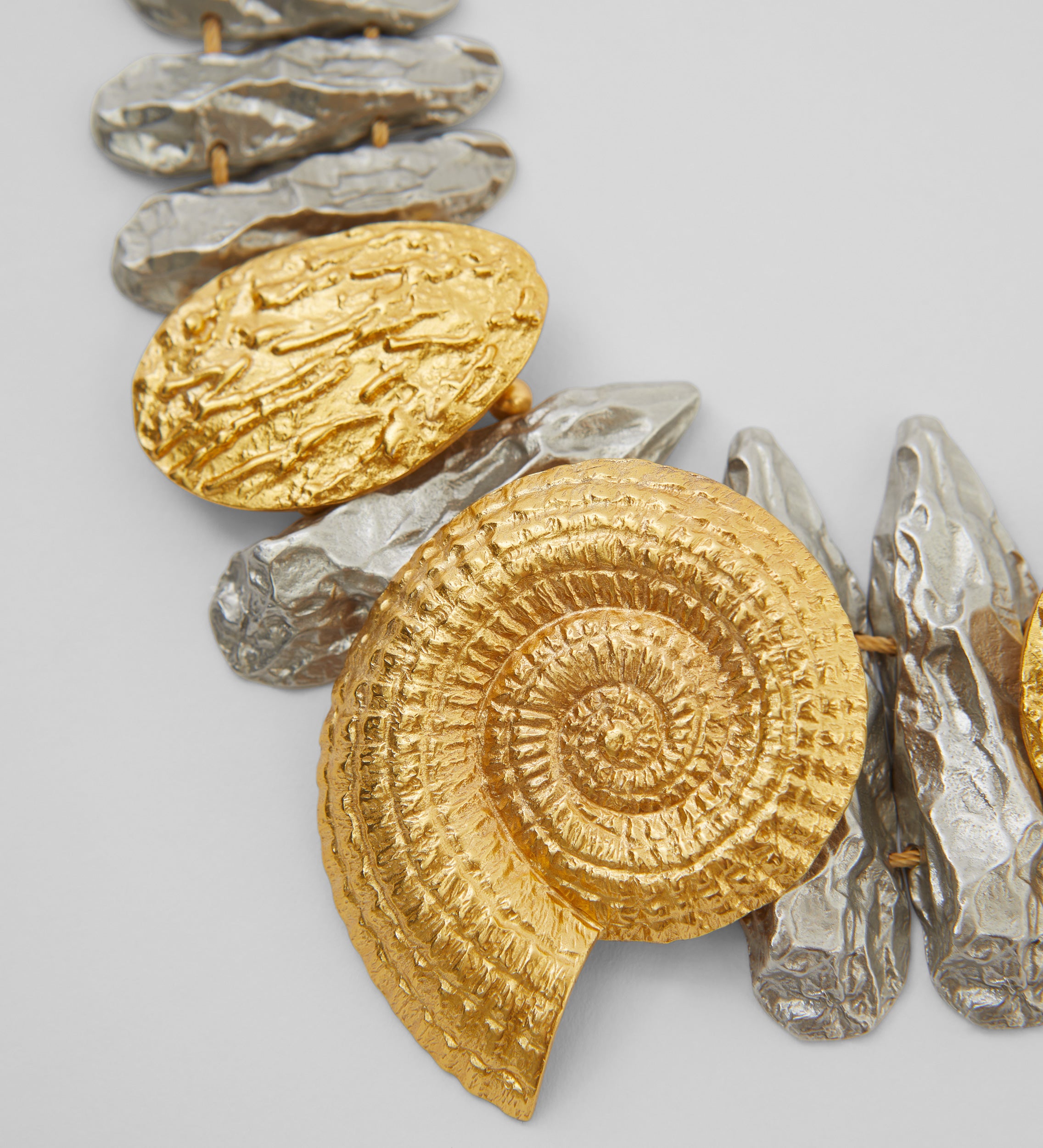 Collar tipo gargantilla que combina figuras en forma de amonitas dorados y piedras de color acero.