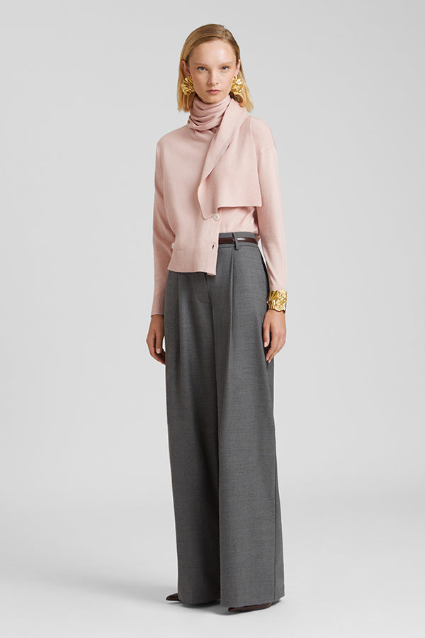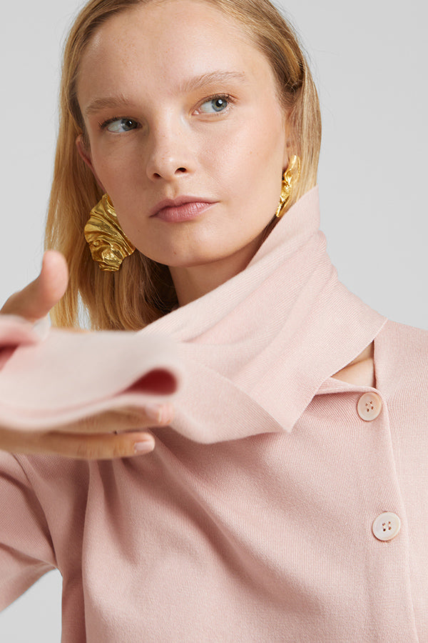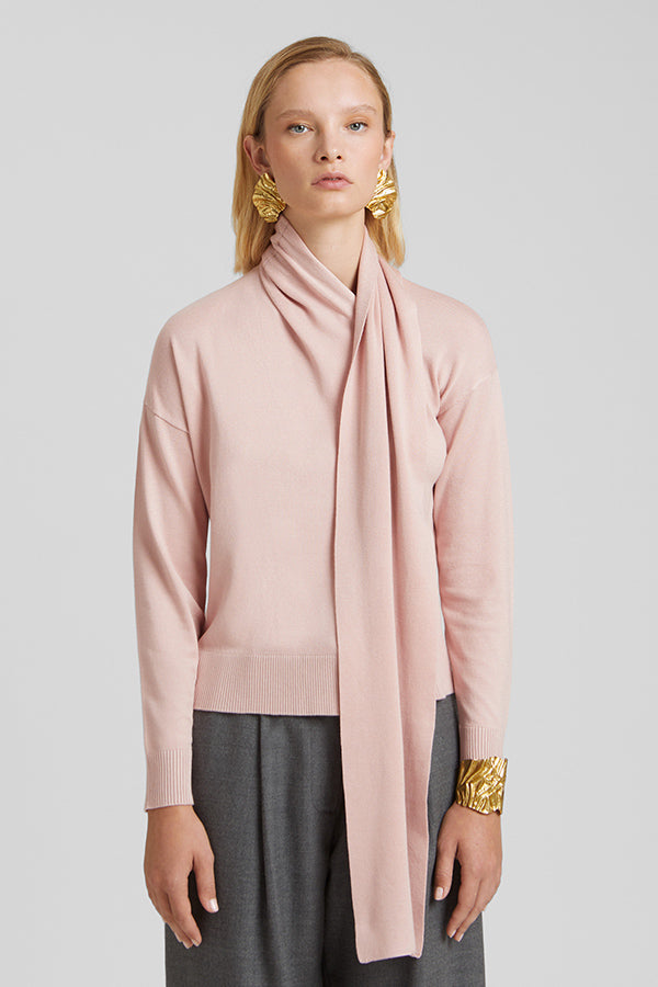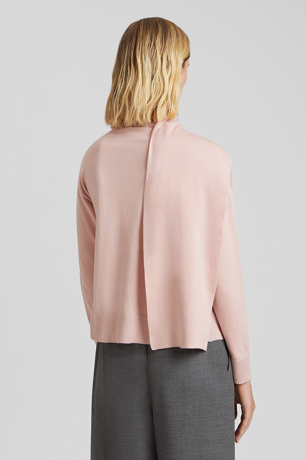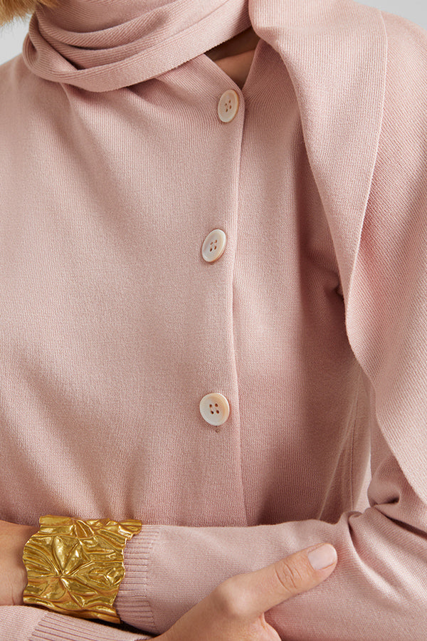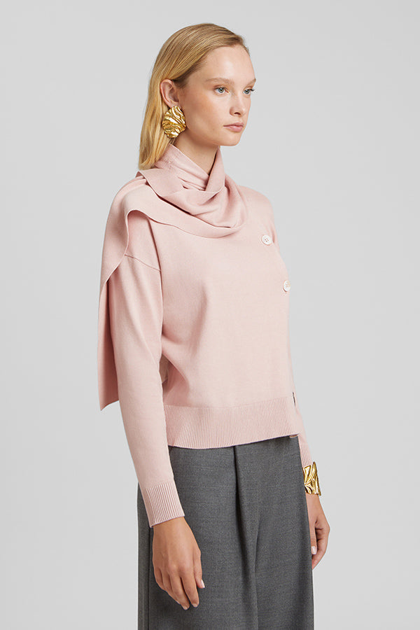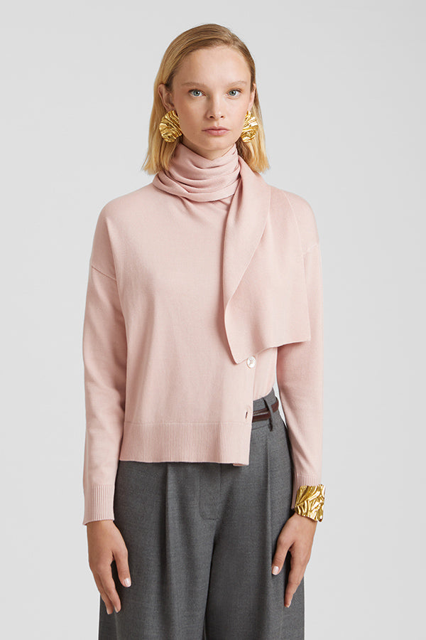 Jersey de punto fino con bufanda incorporada. Botonadura en el delantero.