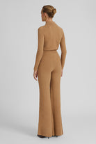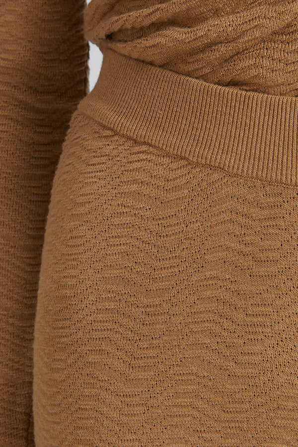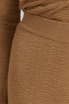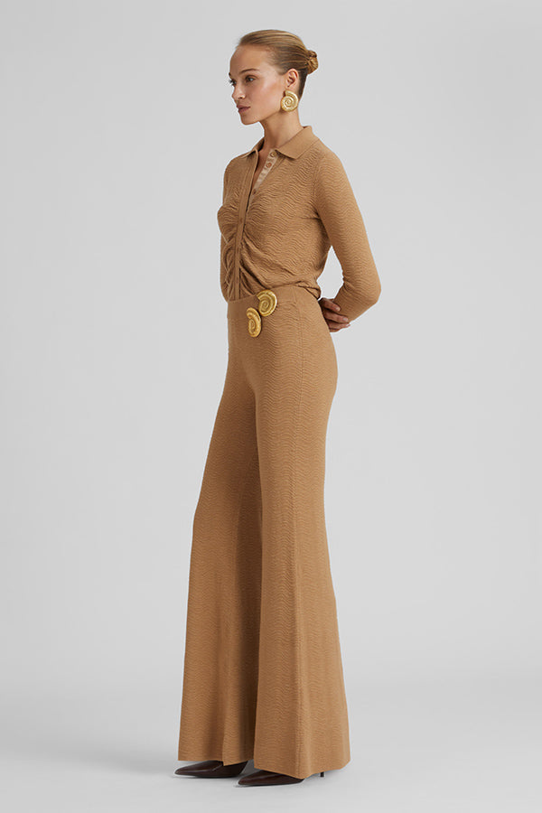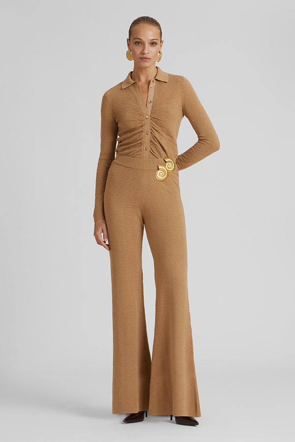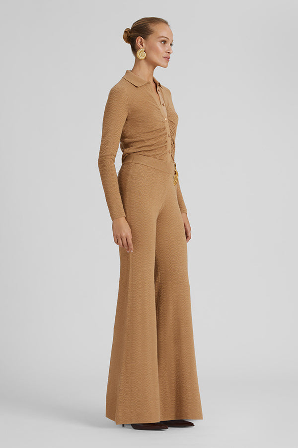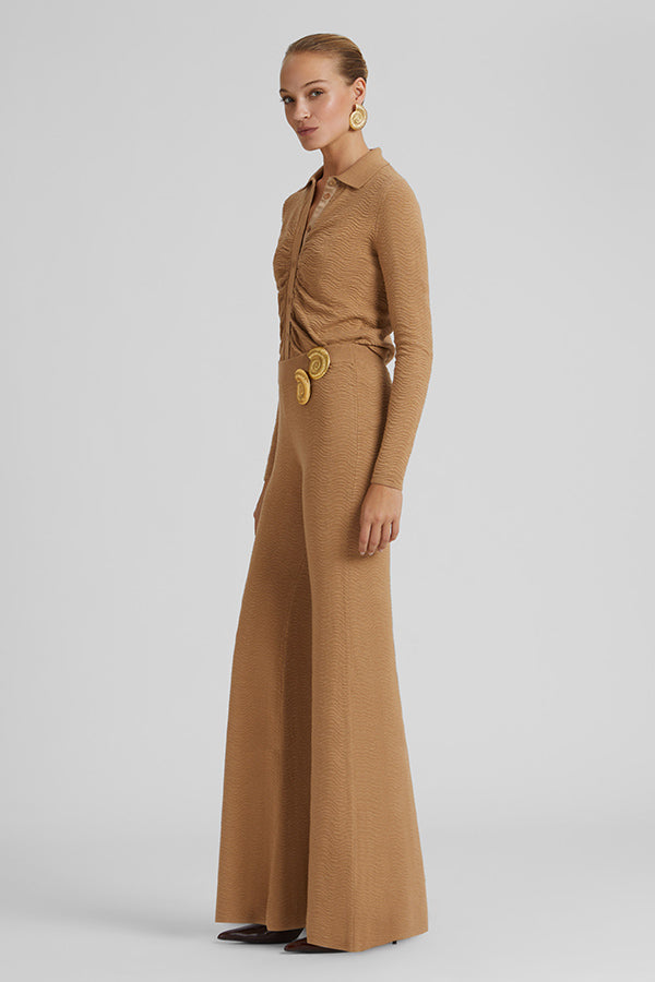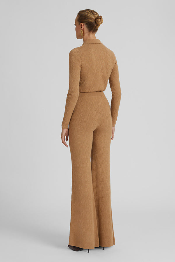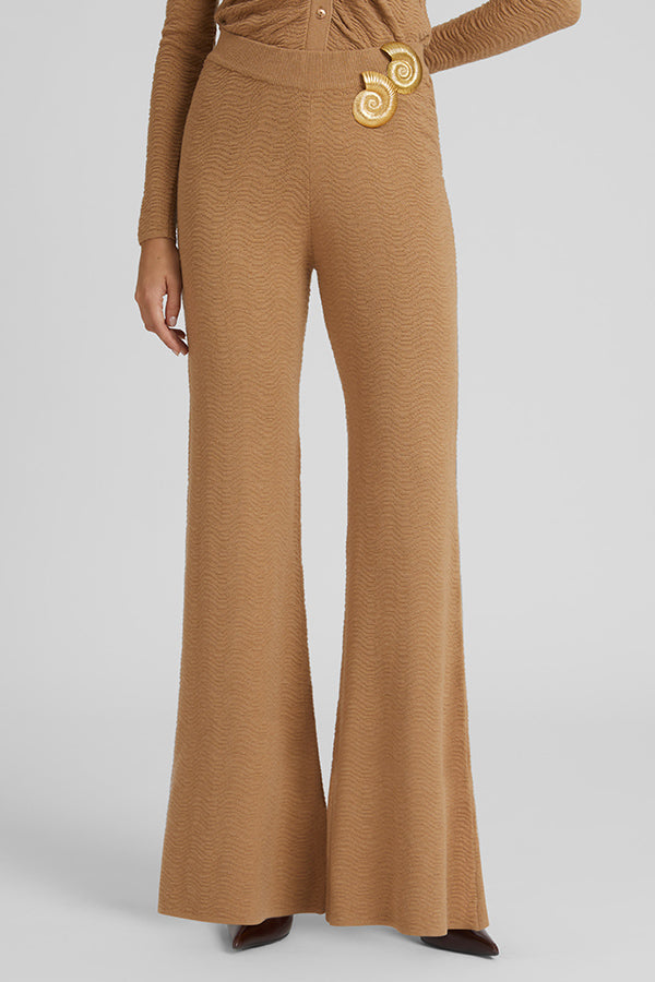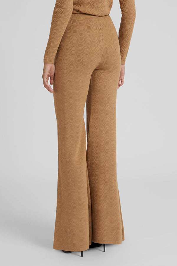 Pantalón acampanado realizado en un punto texturizado. Tiro alto. Cinturilla con goma interior para máxima comodidad.