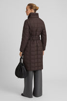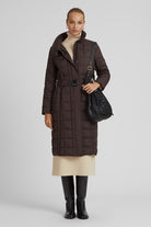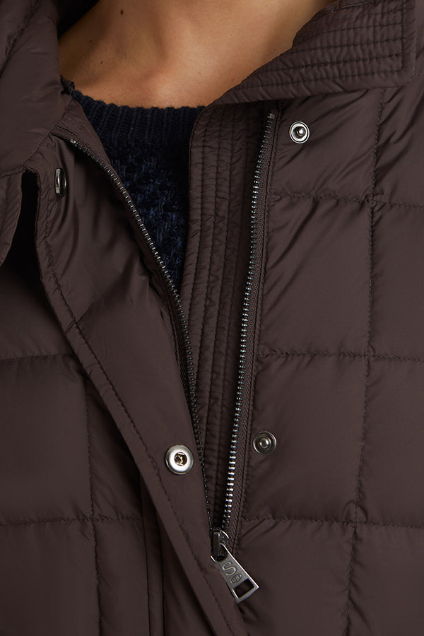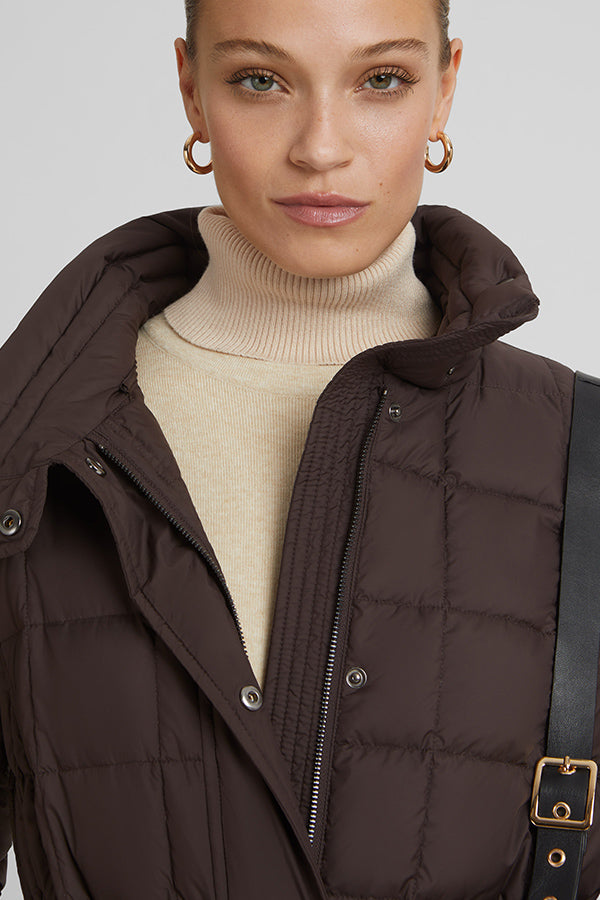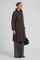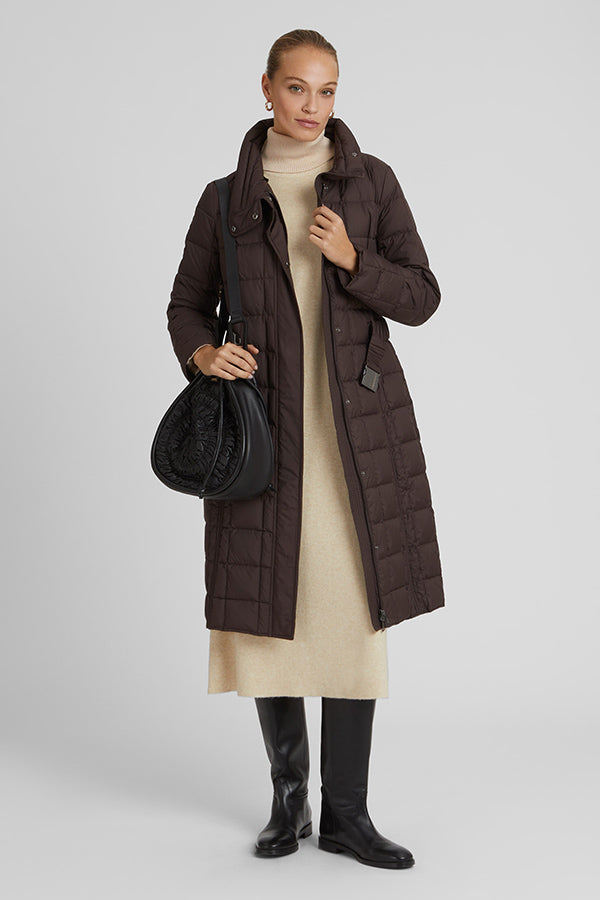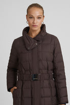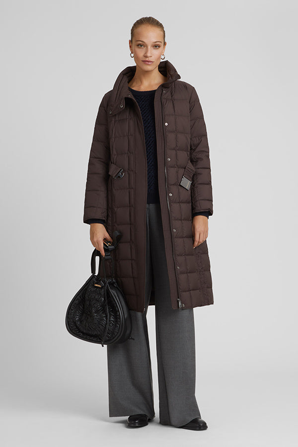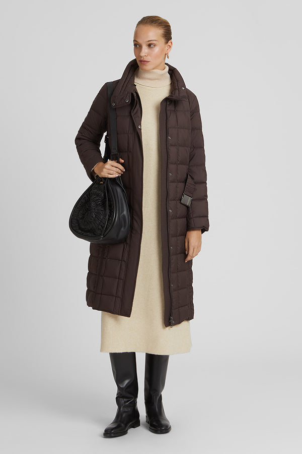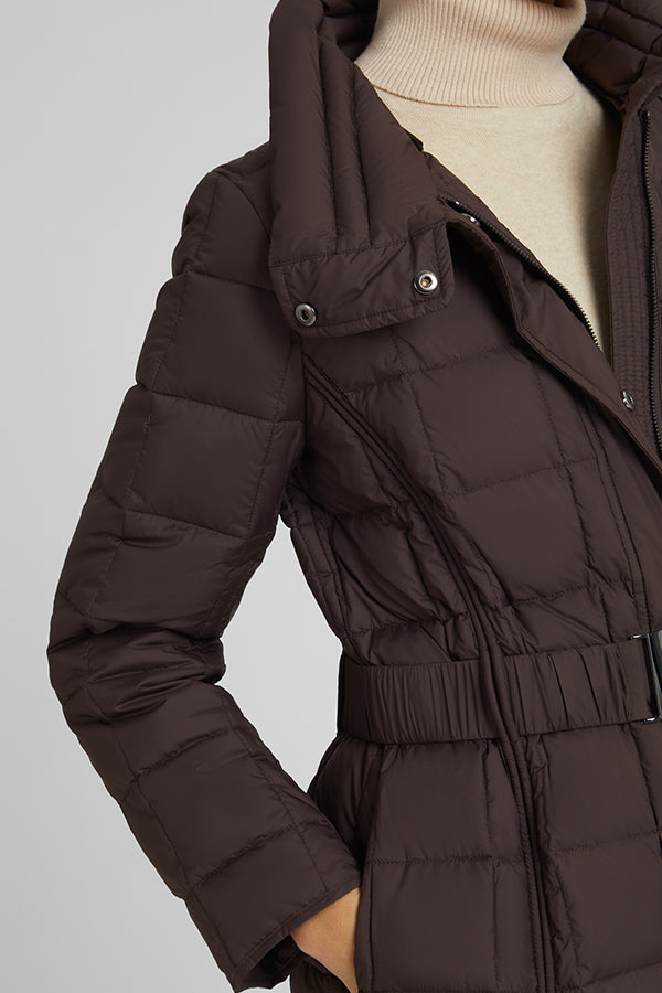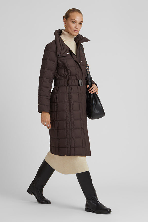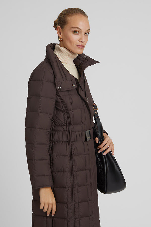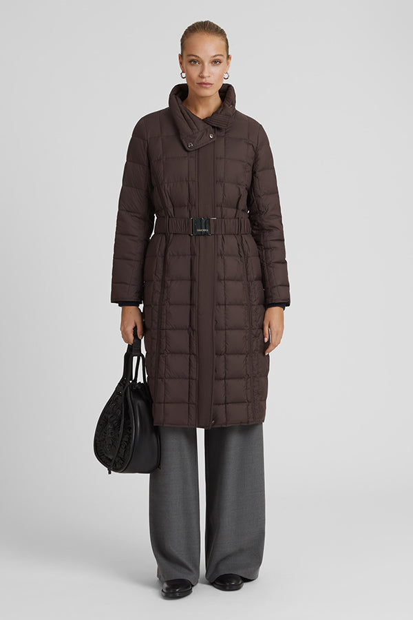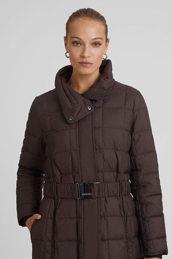 Parka larga acolchada con cuello chimenea. Cierre mediante botones a presión y cremallera ocultos por tapeta. Bolsillos en costura lateral. Cinturón incorporado con hebilla de apertura lateral metálica con el logo grabado a laser.