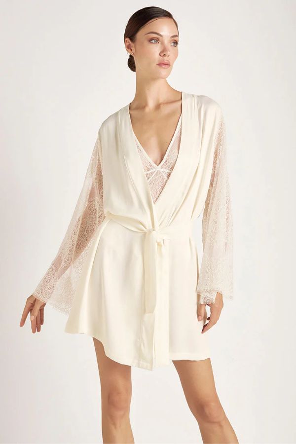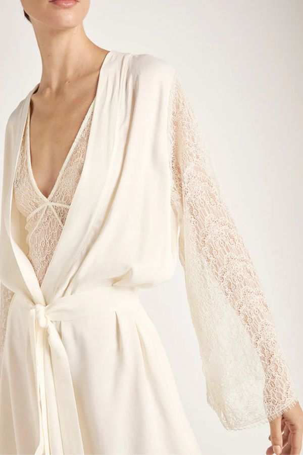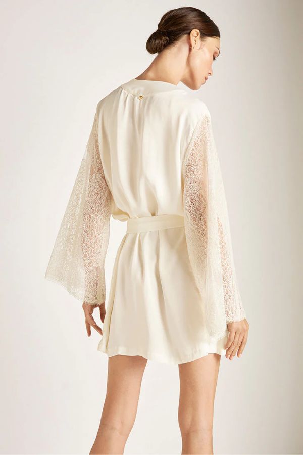 Bata corta de raso con mangas de encaje y detalle de cordón en la cintura.