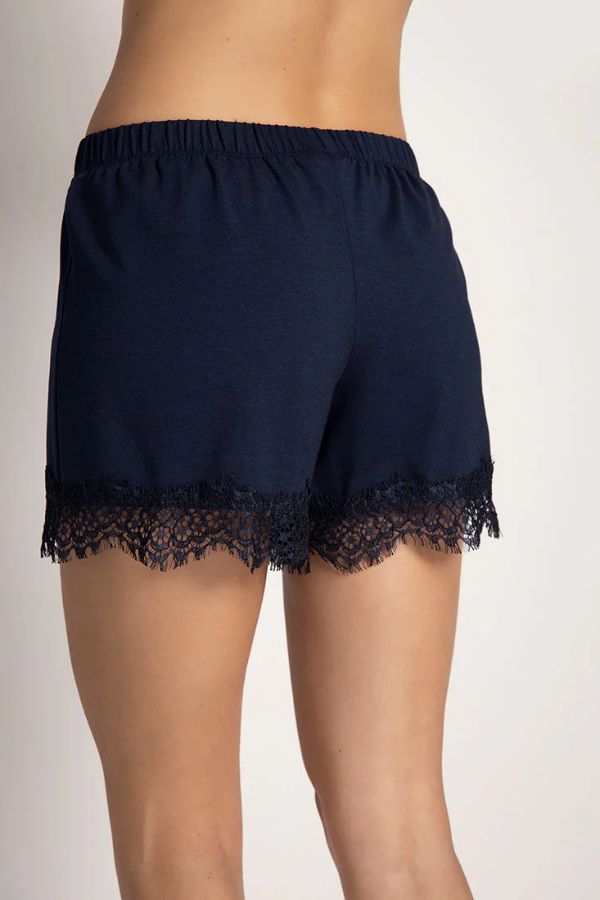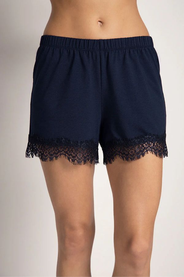 Short lisos en mezcla de algodón. Ribete de encaje en el dobladillo. tejido de punto, sin forro.