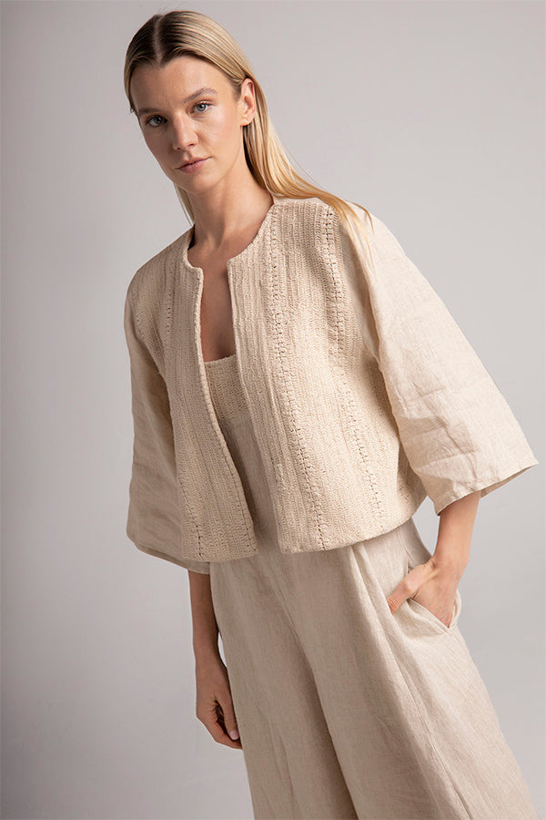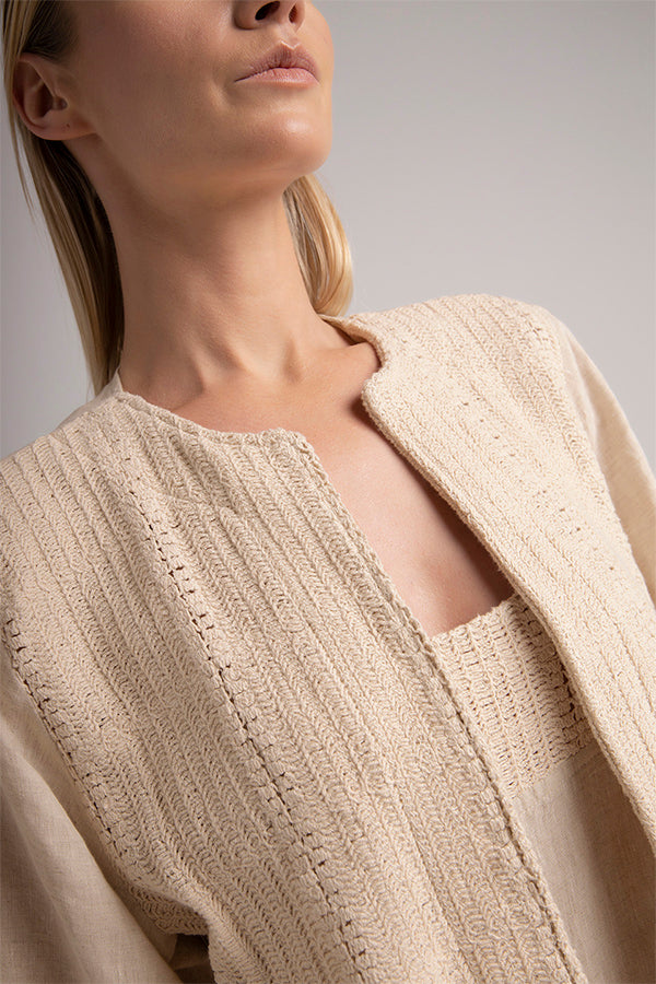 Chaqueta abierta corta caqui tejido a ganchillo jaspeado, espalda y mangas ganchillo en la parte delantera, manga 3/4, detalle bañado en oro para evitar la oxidación, Prenda ECO diseño de lujo, creados con materiales sustentables para el cuidado y conservación del medio ambiente.