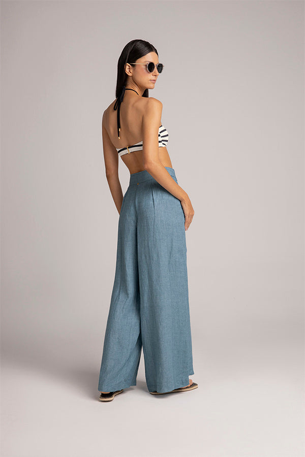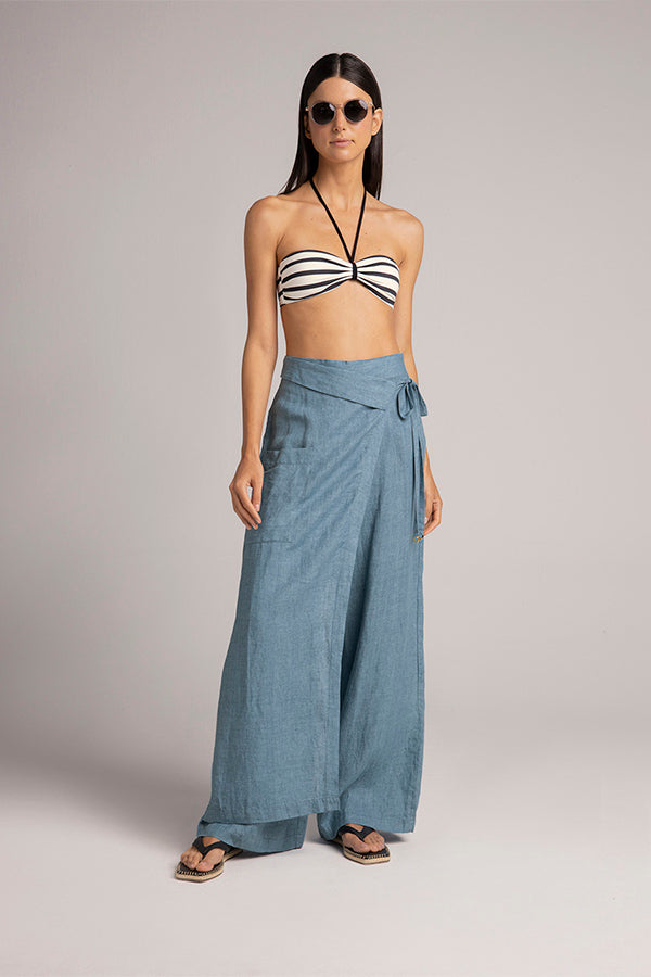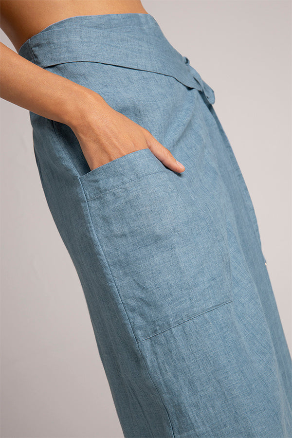 Pantalón envolvente de pierna ancha con detalle de bolsillos, Prenda ECO diseño de lujo, creados con materiales sustentables para el cuidado y conservación del medio ambiente.