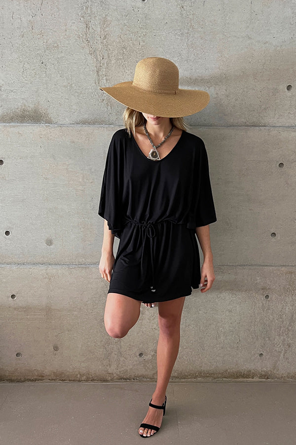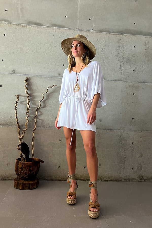 Vestido manga corta cuello en V. con pasador en la cintura y aplicaciones de cuarzo