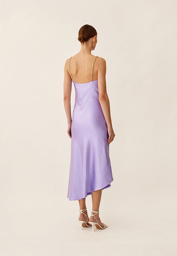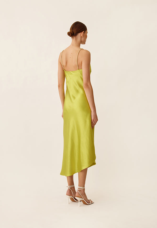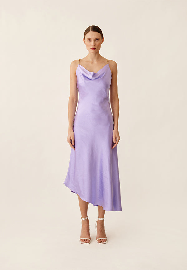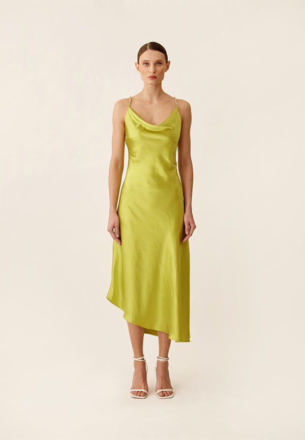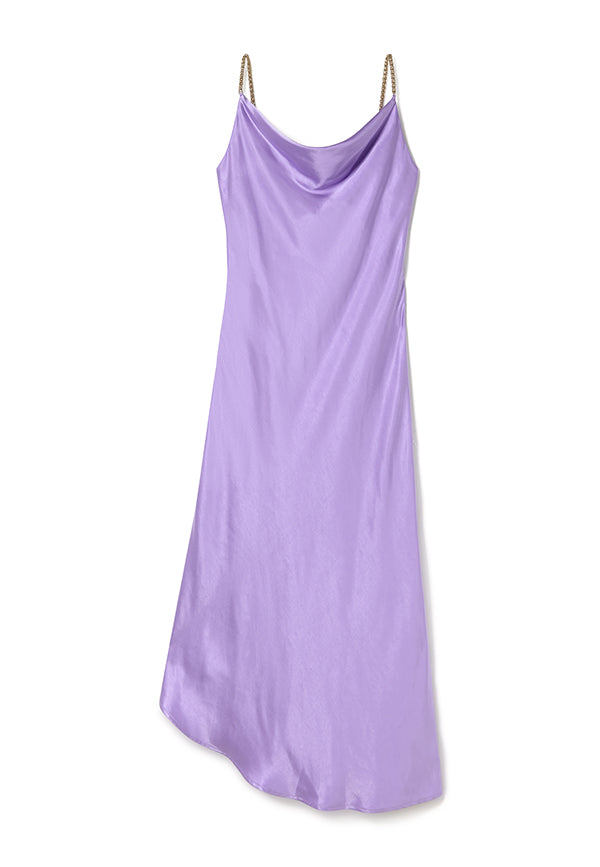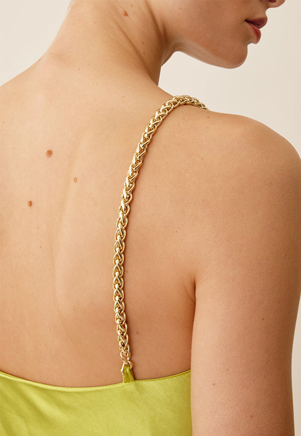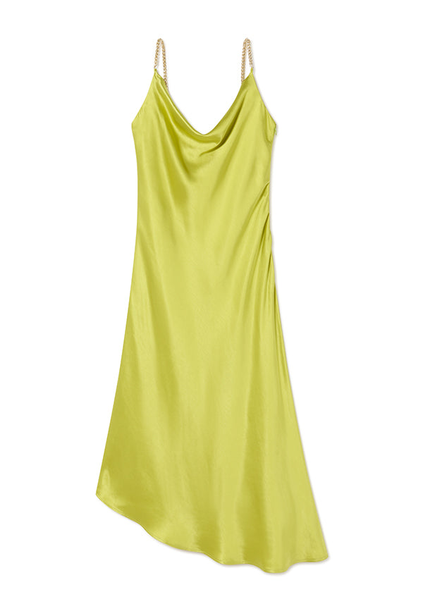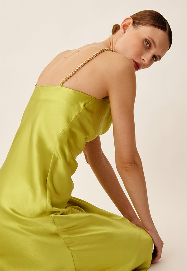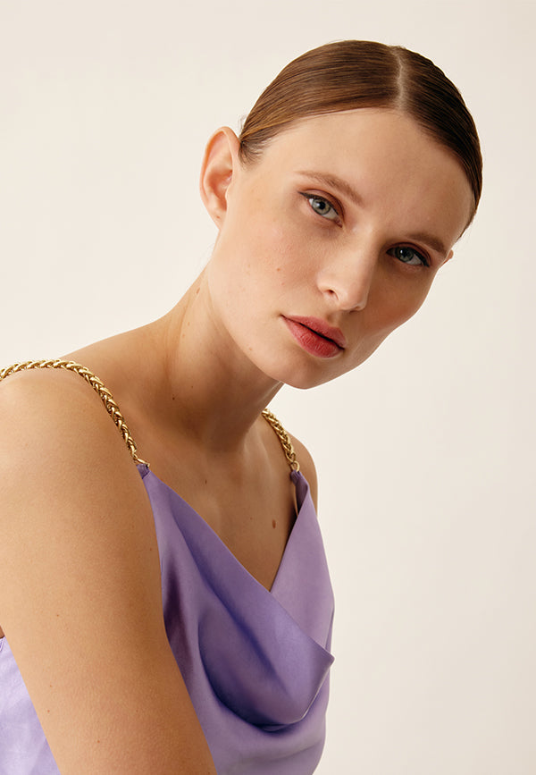 Vestido largo de satén con escote drapeado y tirante de cadena dorada. Cierre con cremallera lateral.