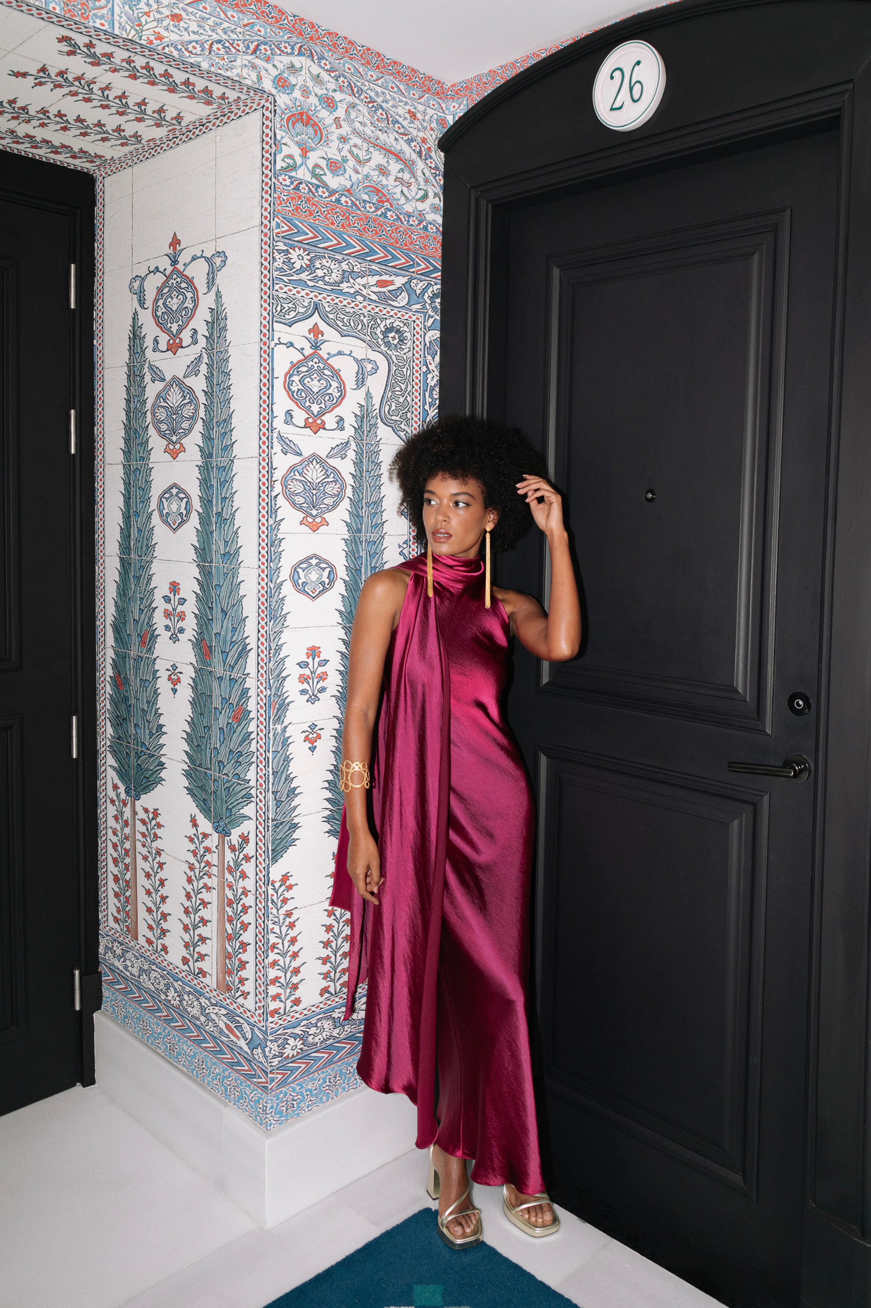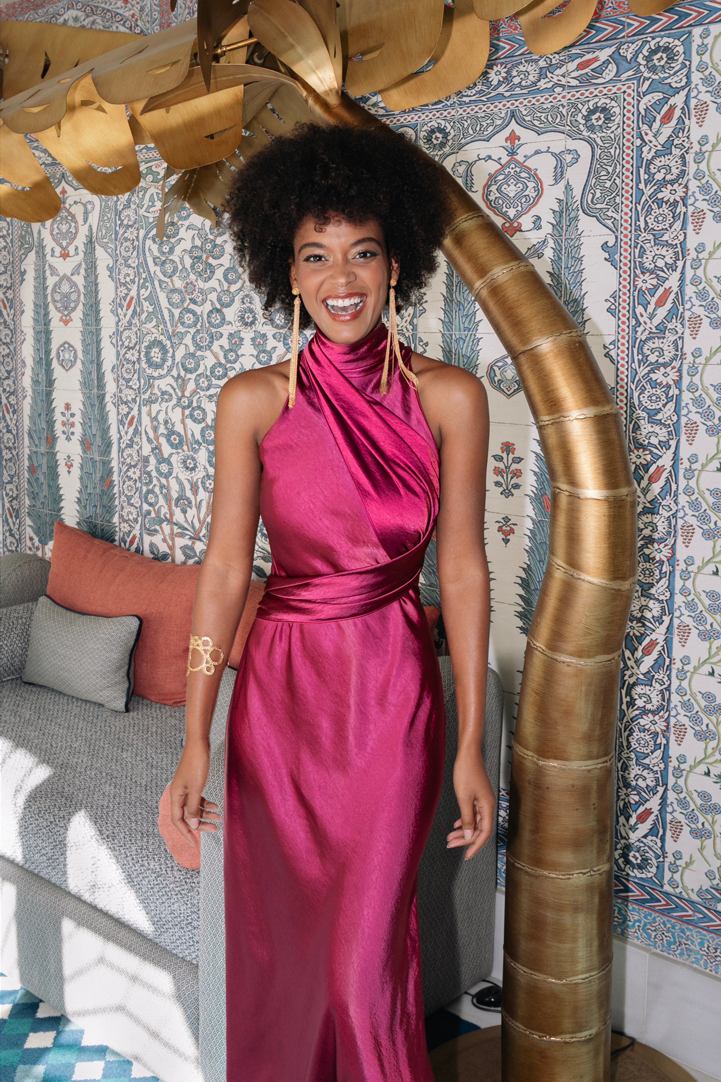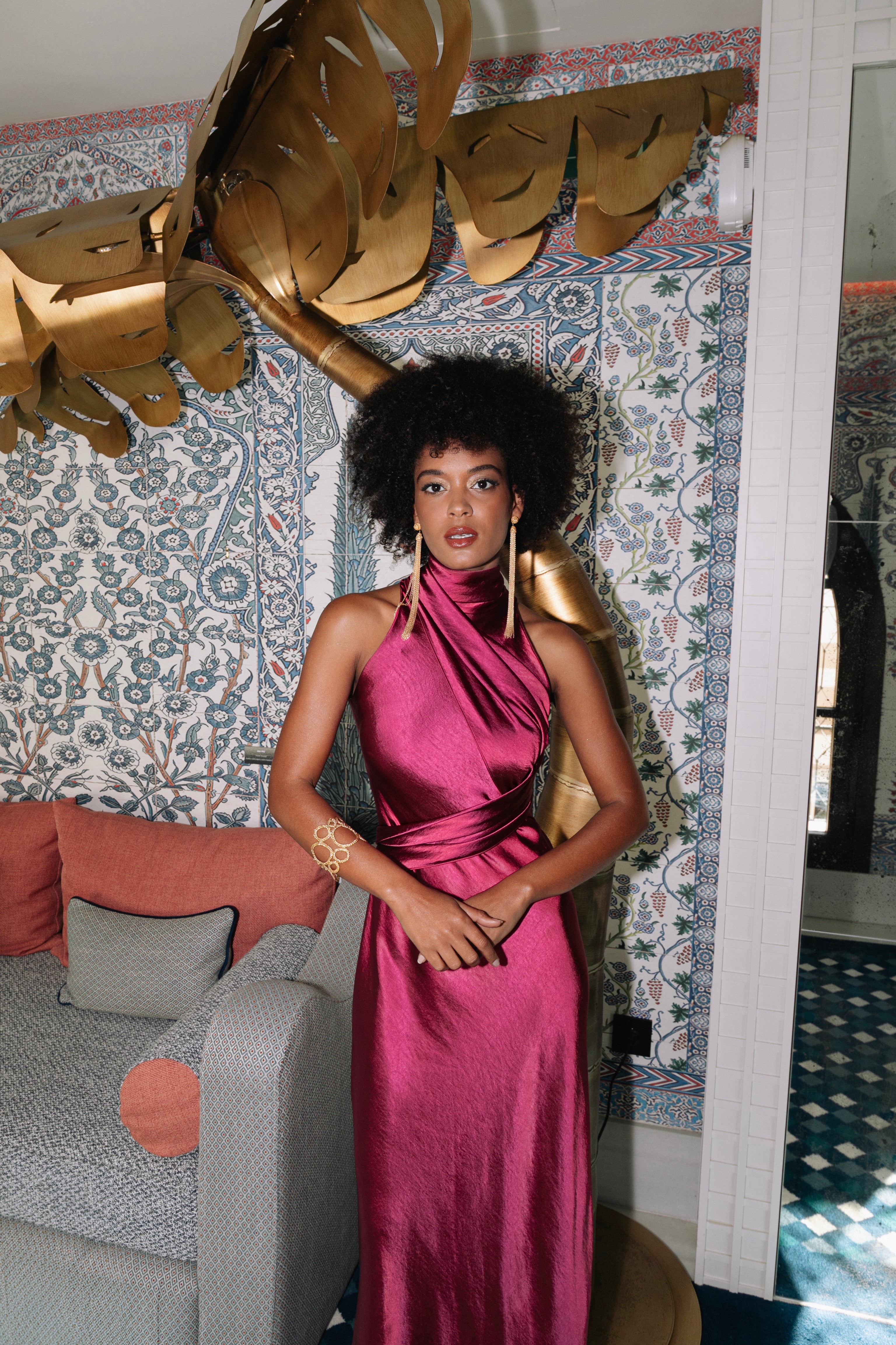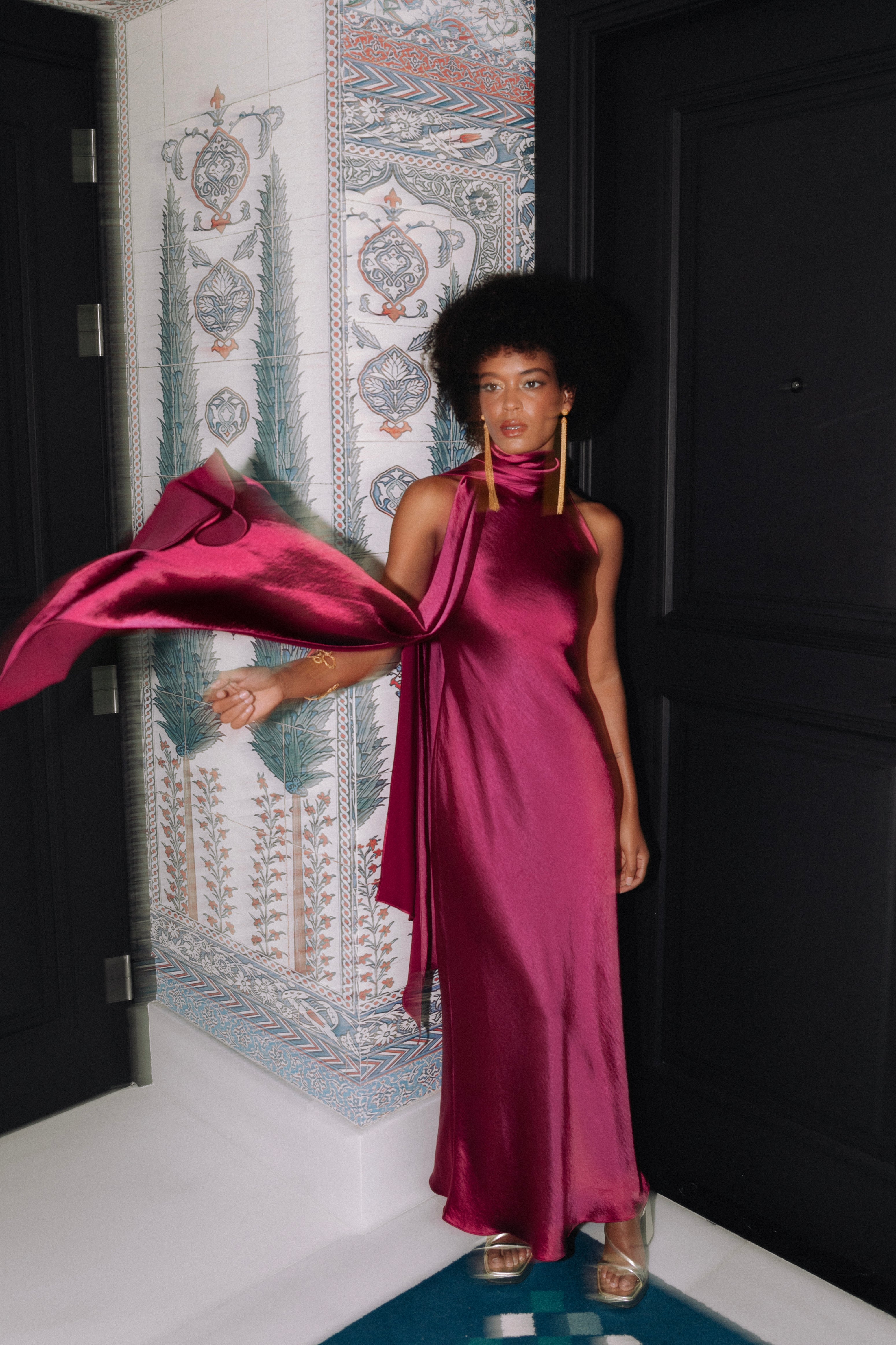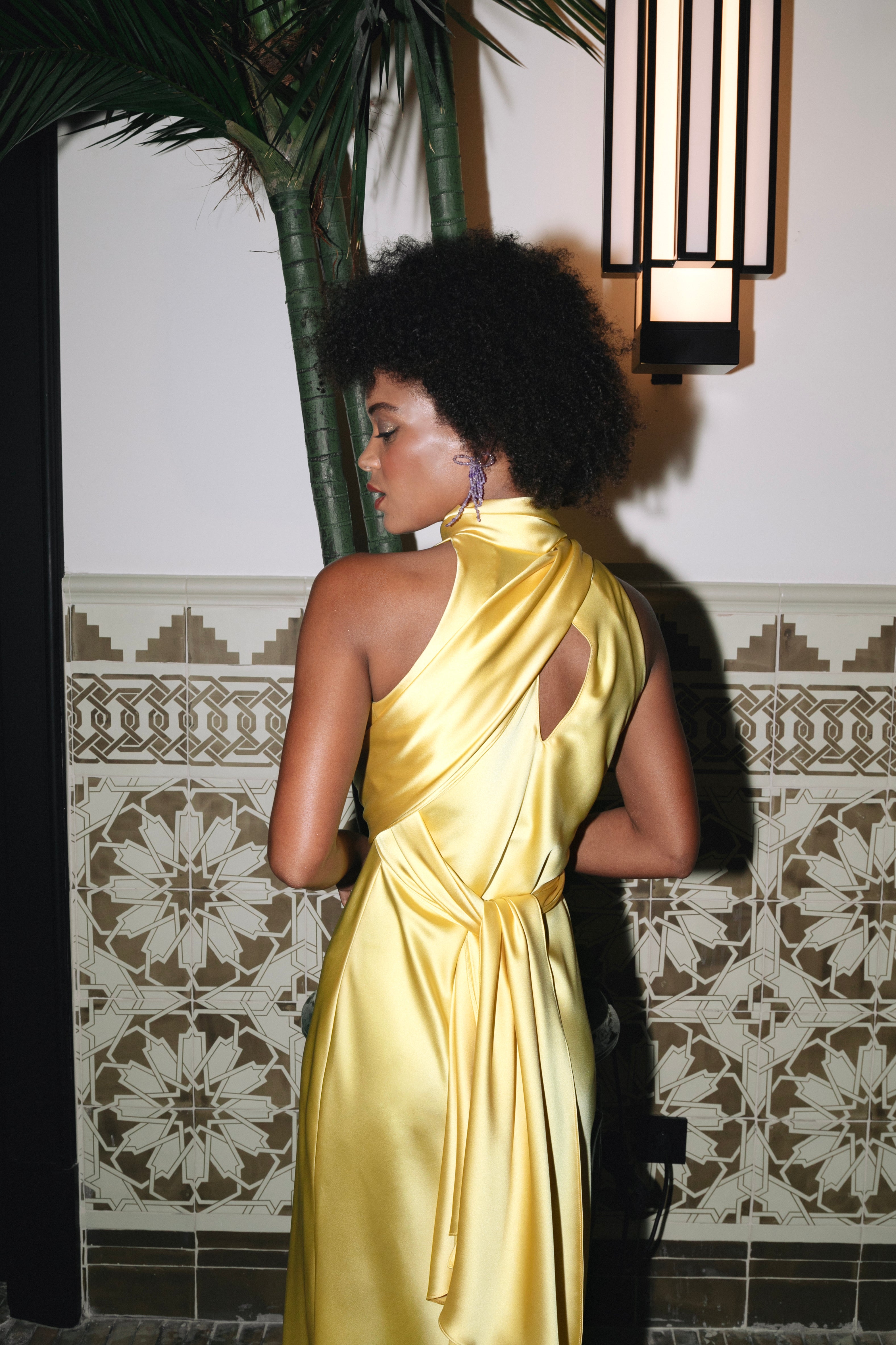 Vestido es un must que debes tener en tu armario de eventos. Su versatilidad te ofrece numerosas opciones doble lazada que permite multi-posición. Cruza las lazadas por la parte del pecho anudándolas a la espalda. Prepárate para ser la estrella de la fiesta y la invitada más elegante. Cortado al bies para realzar la figura