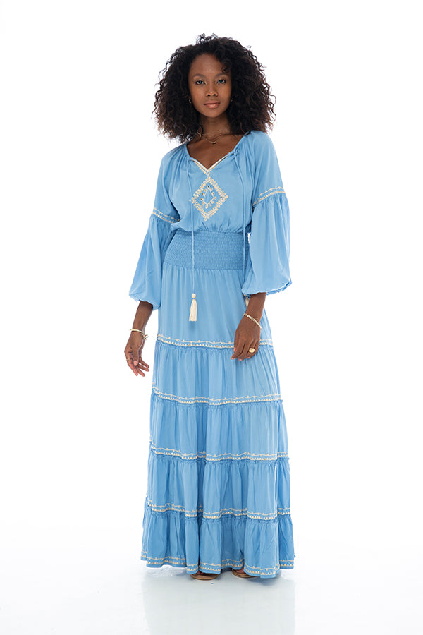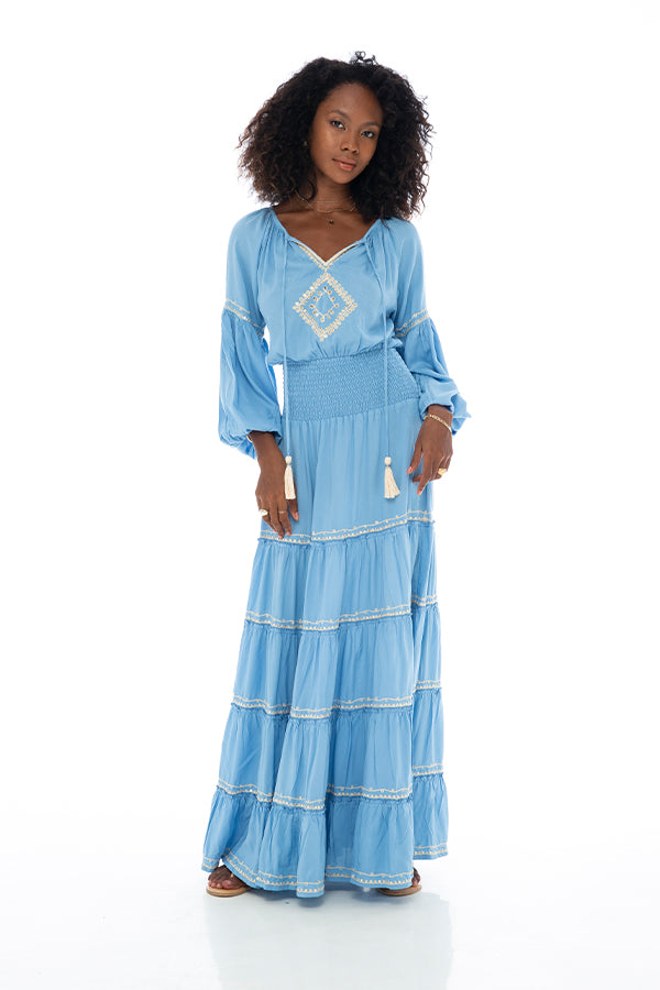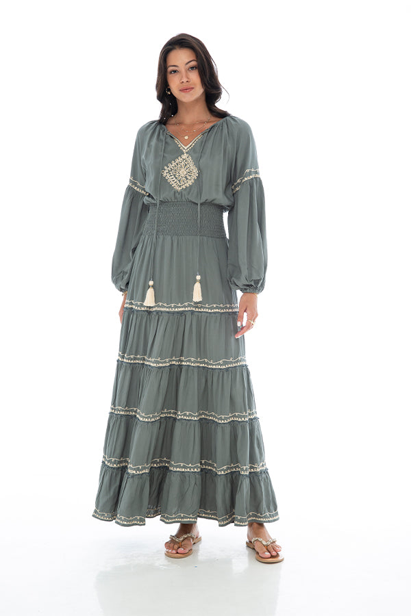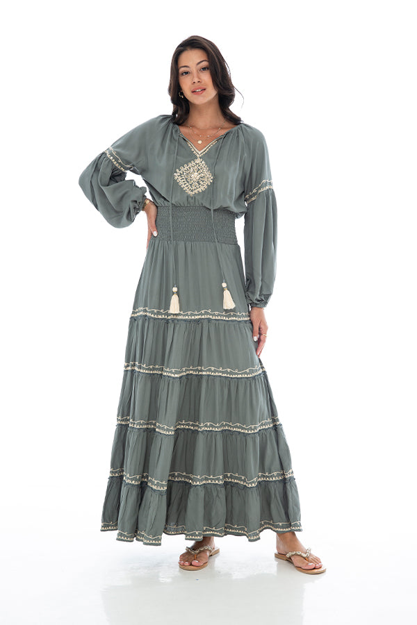 Vestido largo con tiempos, cuello en V con tirantes y detalle de borlas, manga larga, cintura ancha elástica tipo panal de abeja.