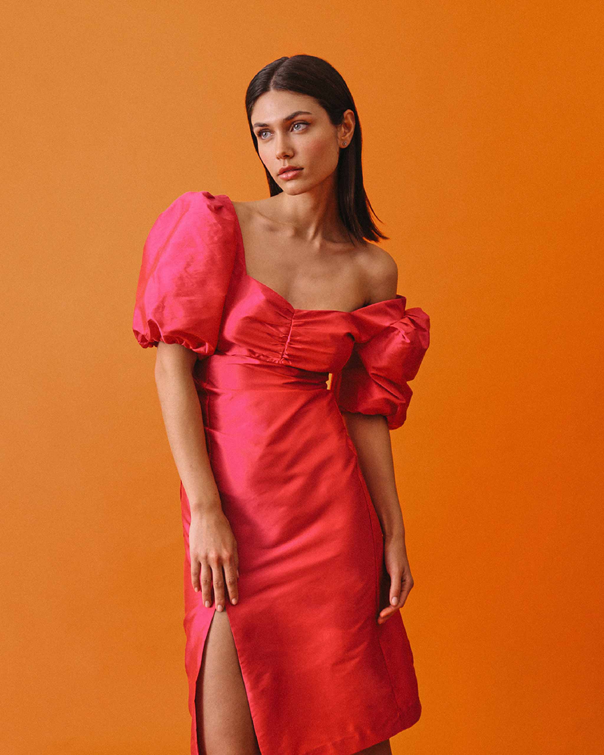 Vestido tubo en tejido de tafeta, manga abullonada y escote corazón con fruncido delane.