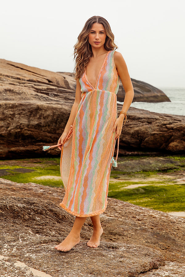 Vestido largo, con escote profundo una vibrante celebración del color inspirada en los tonos caleidoscopios de Río de Janeiro. Confeccionado con meticulosa atención al detalle, el vestido largo Marina es una obra maestra del diseño que encarna la esencia de la elegancia tropical. Su silueta fluida cae suavemente en cascada con cada paso, evocando la fluidez de las icónicas playas de Río.
