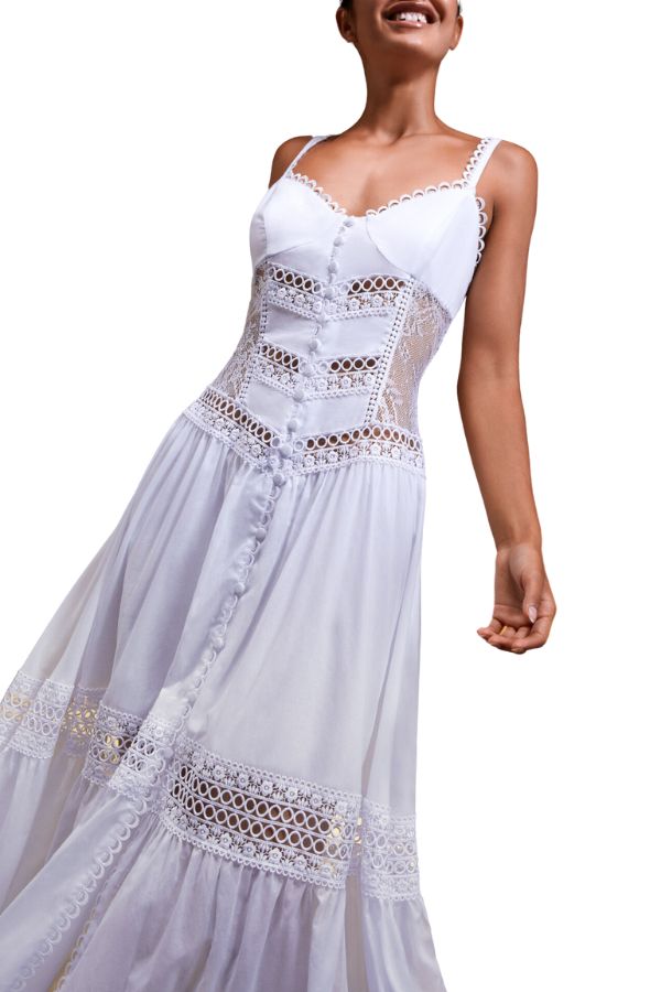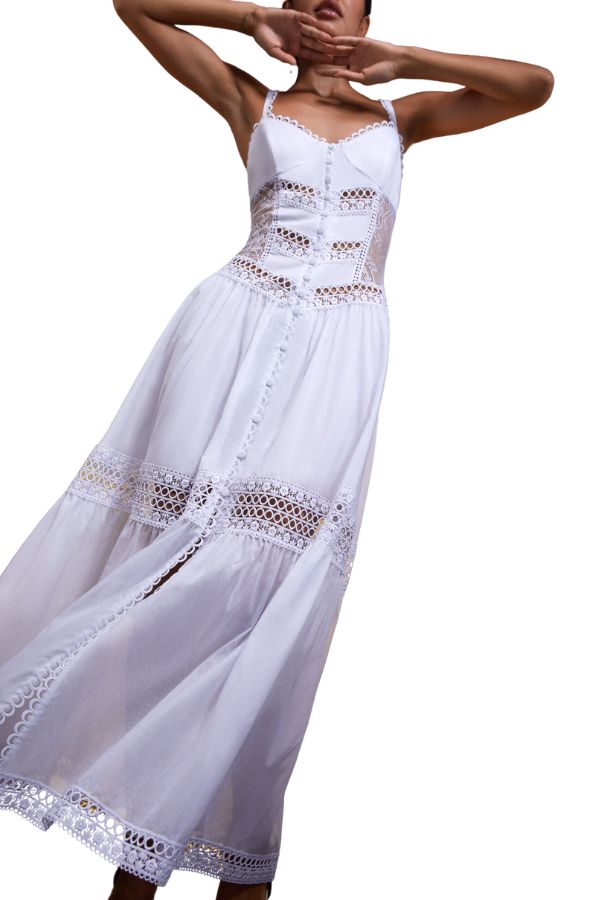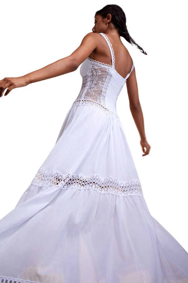 Nuestro maxi vestido Tiana es una pieza sofisticadamente única. Su silueta con laterales de blonda crean una elegante continuación a sus paneles centrales de voile adornados con guipures. Su elaborada falda dota de movimiento y delicadeza a esta creación.