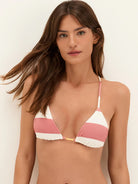 Top de bikini triangular clásico con un diseño chapado en oro de forma geométrica que adorna la parte delantera y trasera. Esta popular silueta de bikini ofrece una excelente elevación y soporte mientras alarga la espalda y favorece tu forma natural.