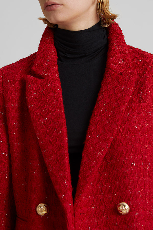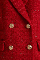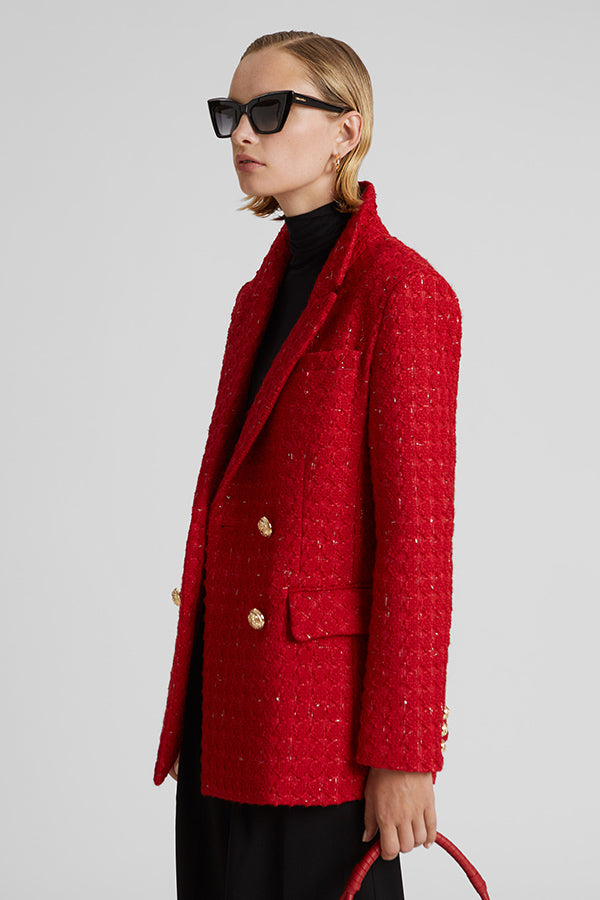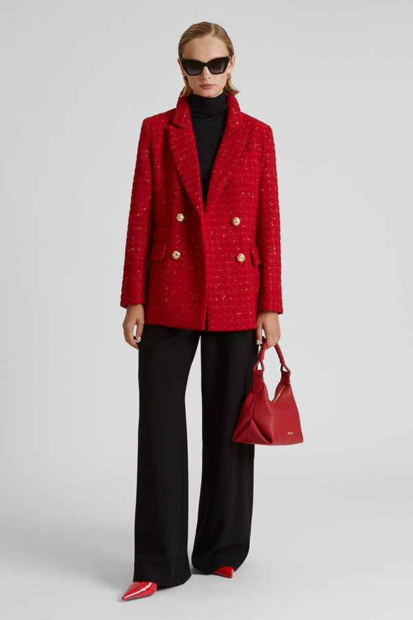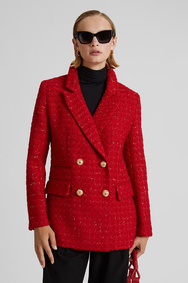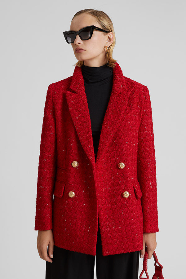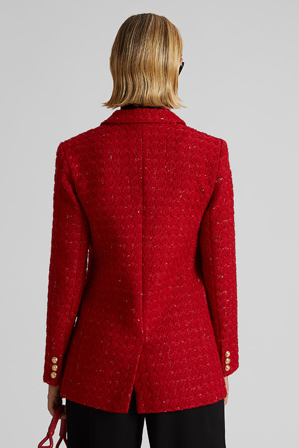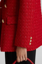 Americana de tweed con hilo de lurex. Cuello con solapa de muesca. Cierre mediante doble botonadura frontal. Bolsillos con solapa. Bajo con abertura en la parte posterior.