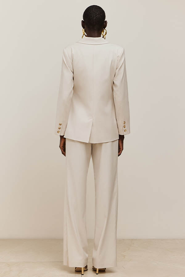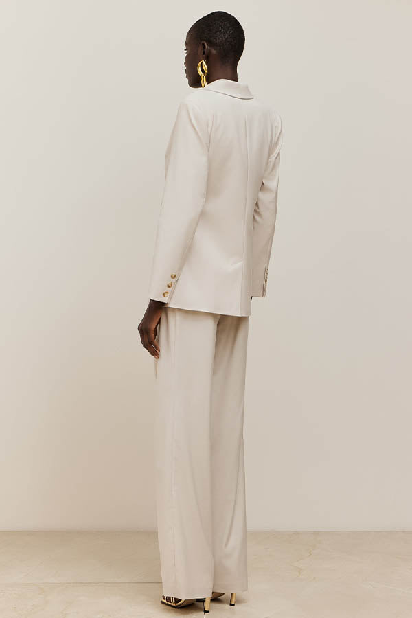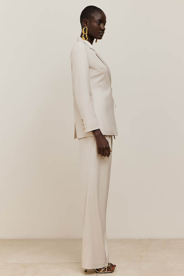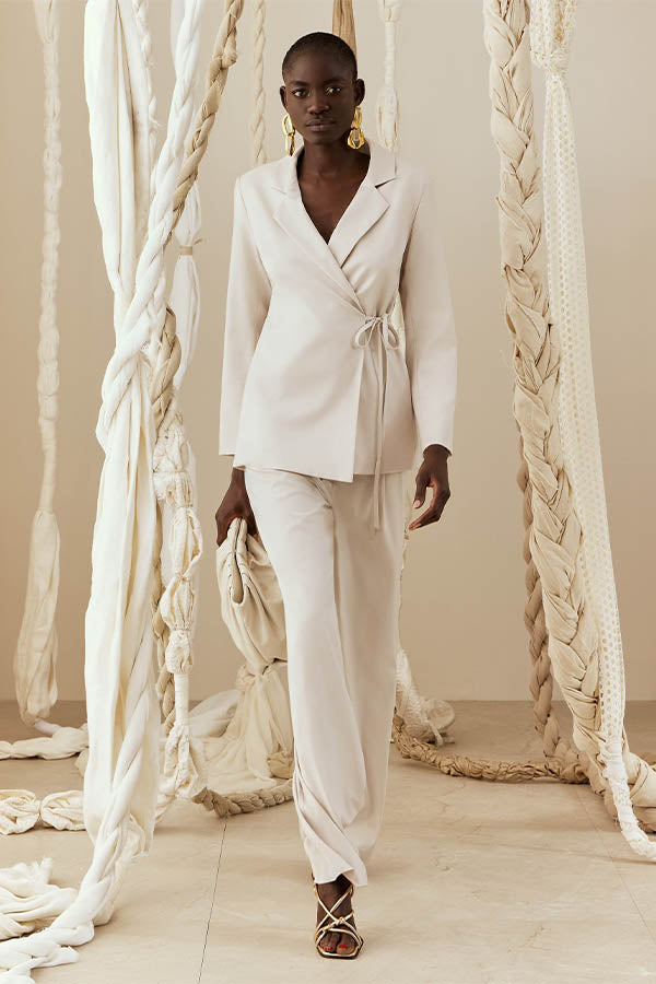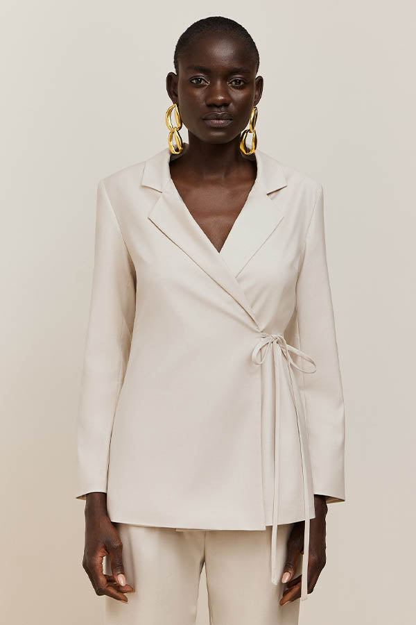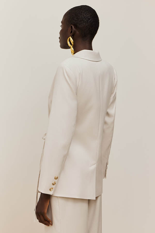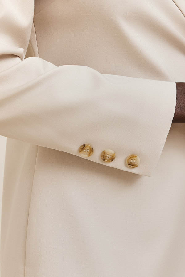 Chaqueta Americana de corte recto con cuello solapa y cierre mediante lazada lateral. Forro al tono.