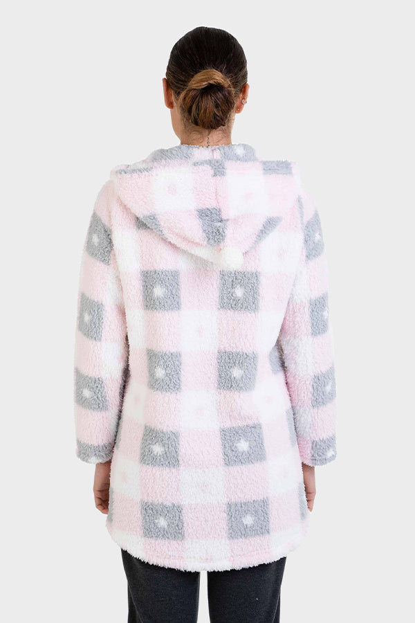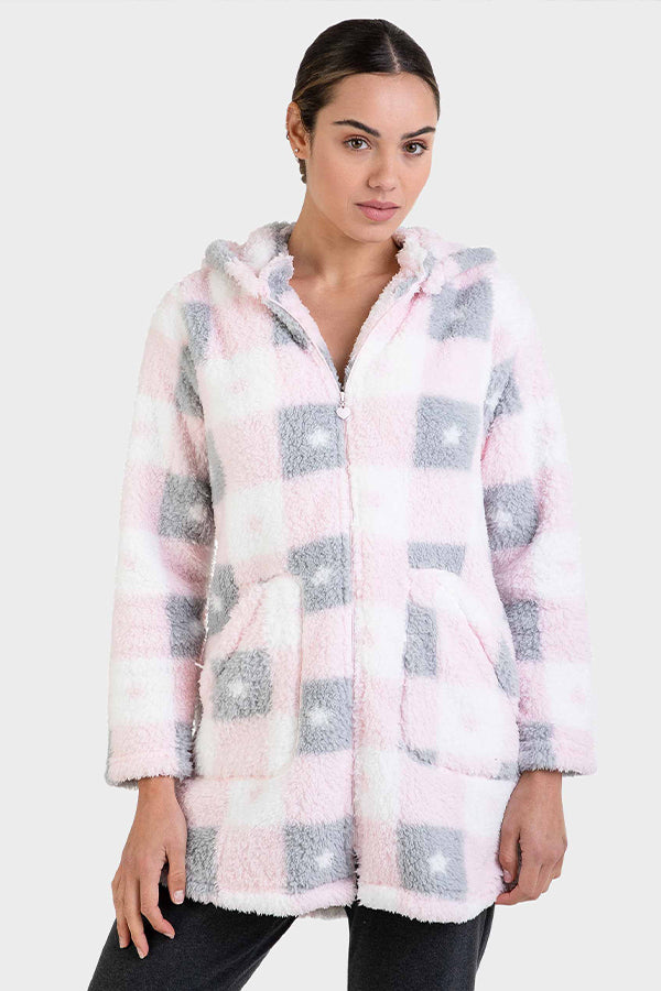 Bata de mujer, corta con cierre de cremallera y capucha desmontable. De tejido muy cálido estampado de cuadros en tonos rosas y grises. Tiene bolsillos en los laterales.