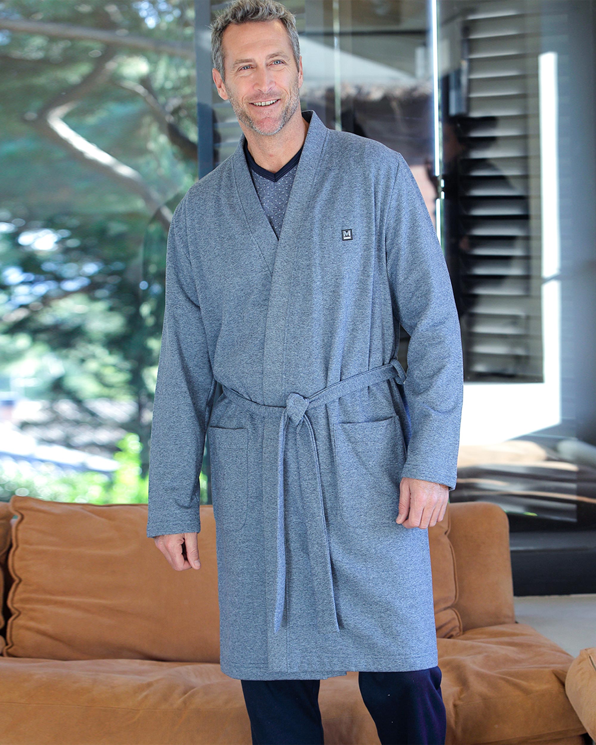Bata hombre lisa, larga, con bolsillos y cruzada con cinturón. Massana