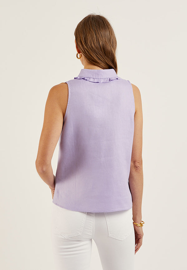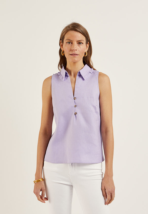 Blusa cuello camisero en V con volantes y botones en la parte de adelante.