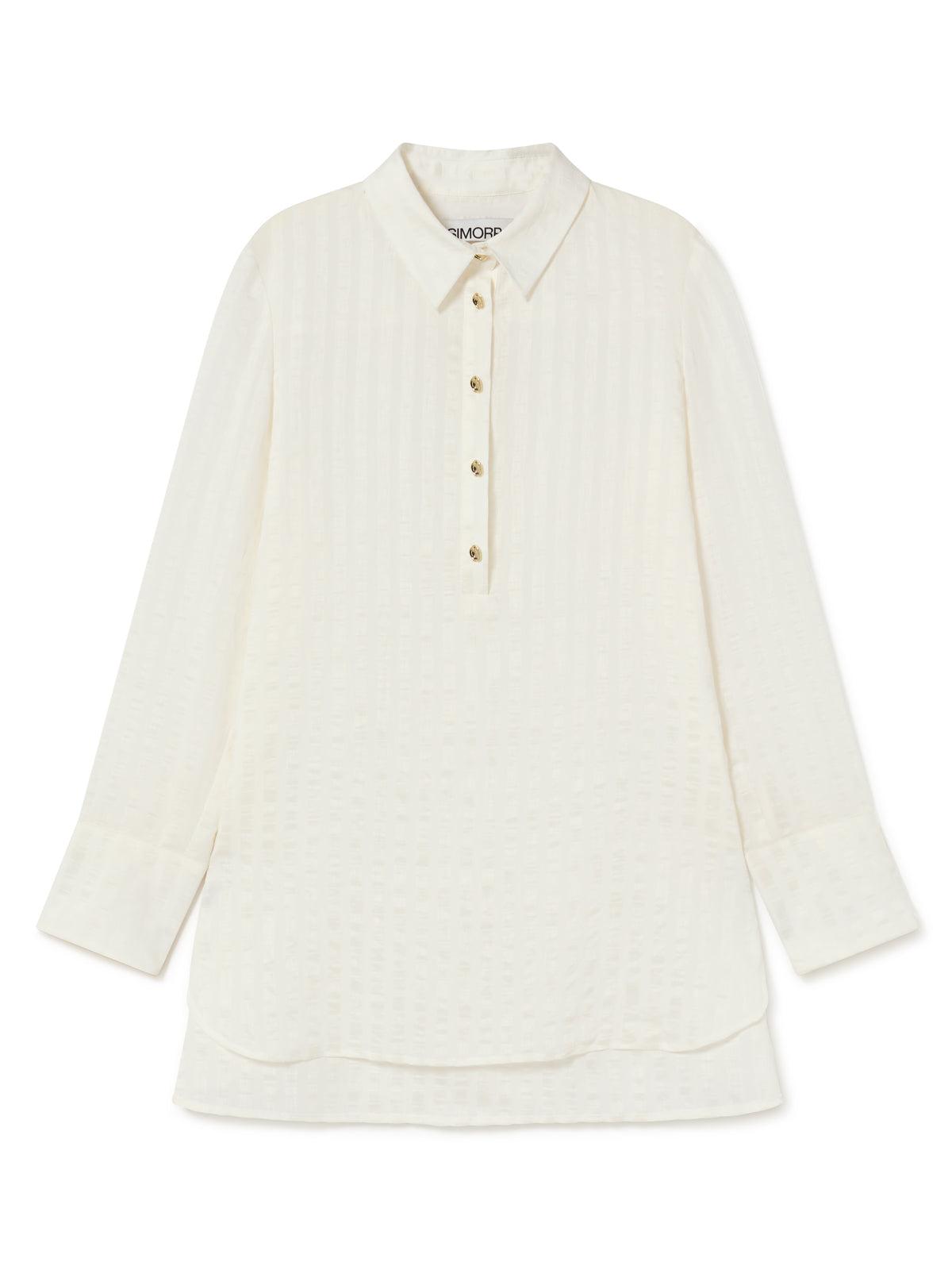 Blusón con textura de cuello polo y manga larga. Aberturas laterales redondeadas.