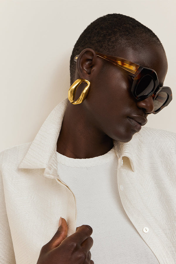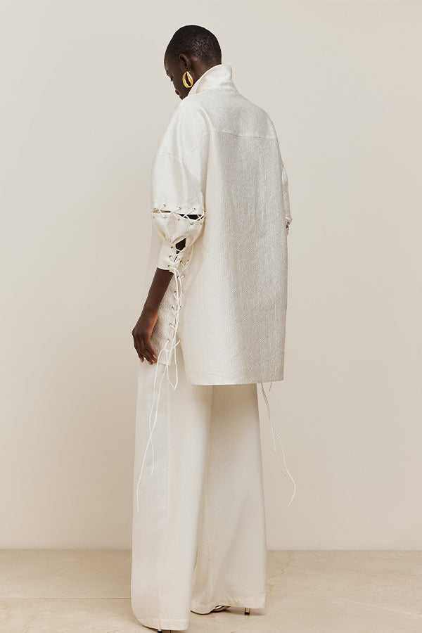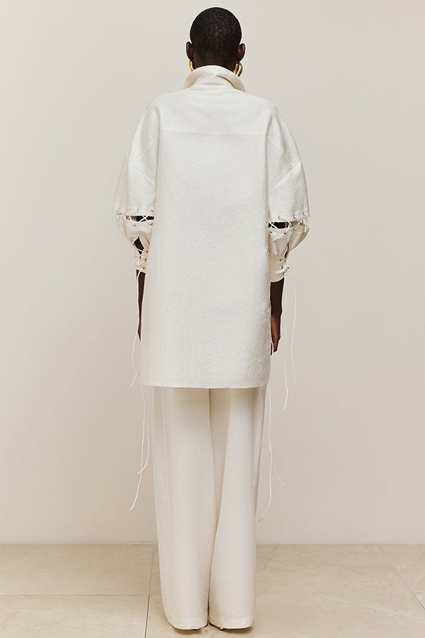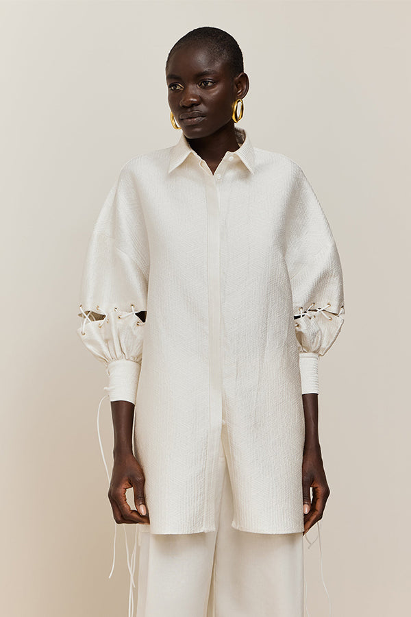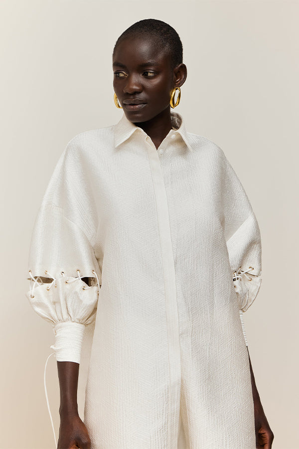 Blusón "oversize" de tejido de jacquard con cuello camisero, manga abullonada con puño y detalles de eyelets metálicos con cordones en mangas.