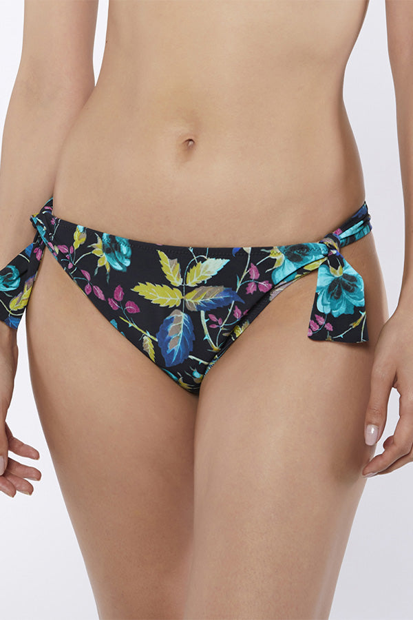 Bottom de bikini con estampado floral de colores ácidos sobre fondo negro. Formas más juveniles con lazos. Regulable con lazos laterales para ajustar a la cadera. Cobertura media.
