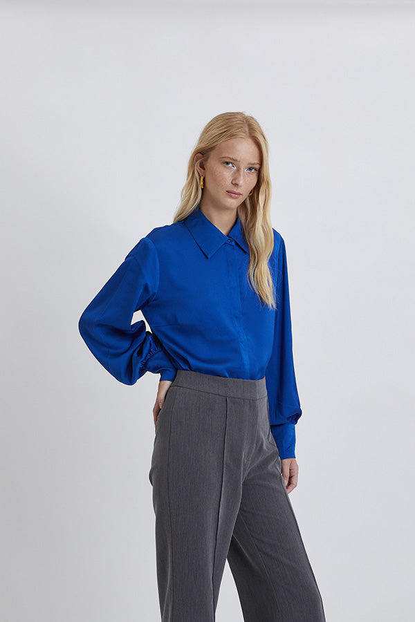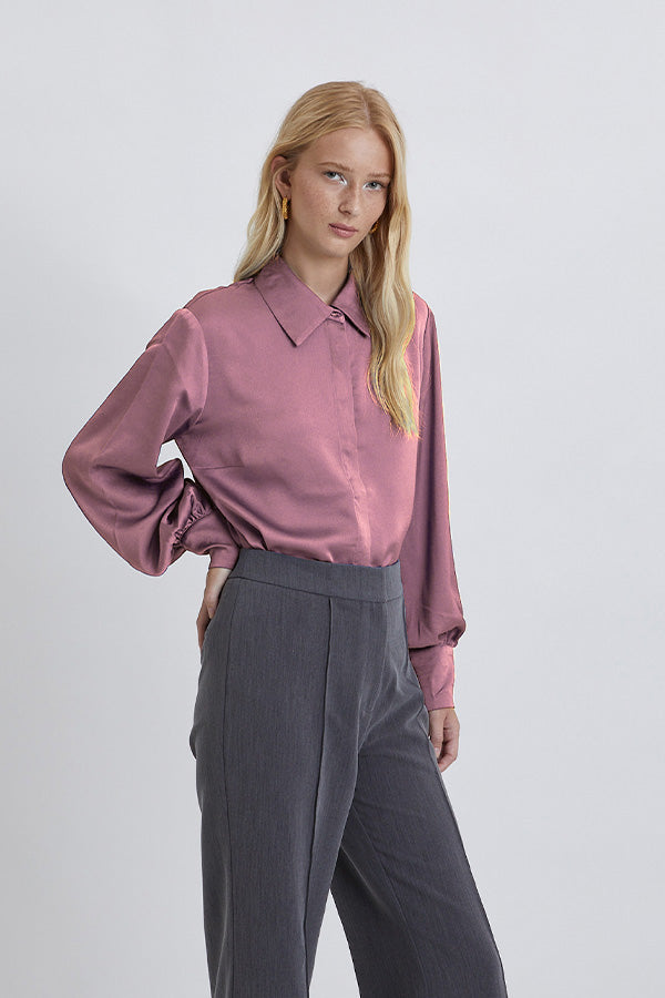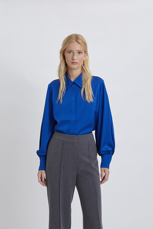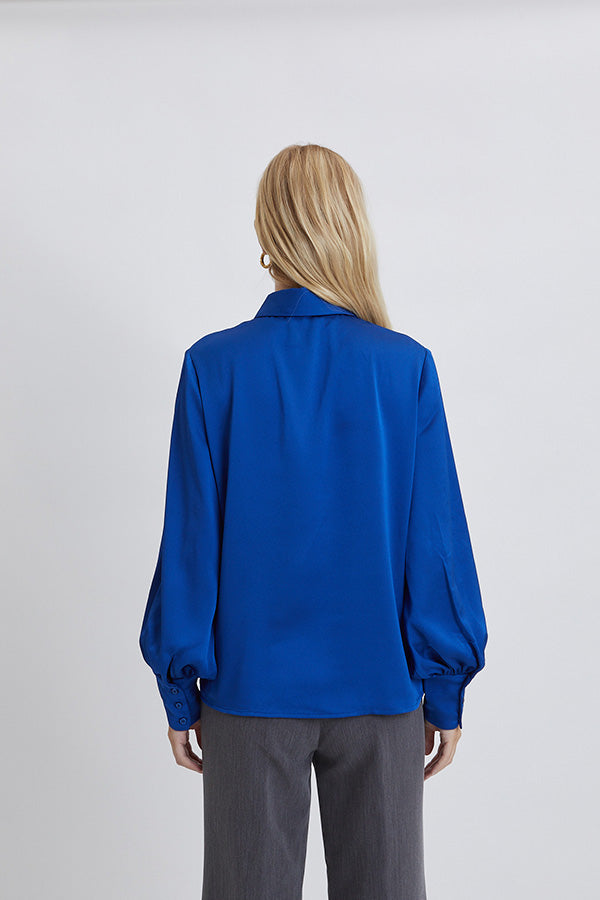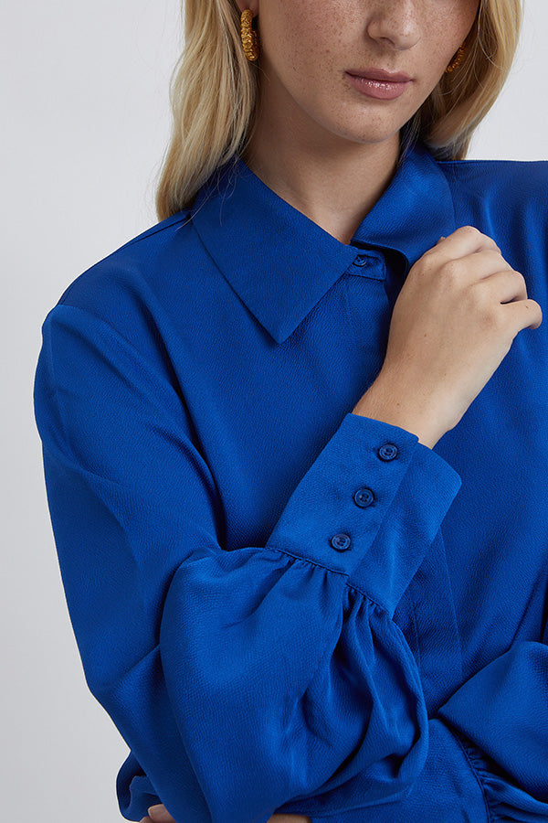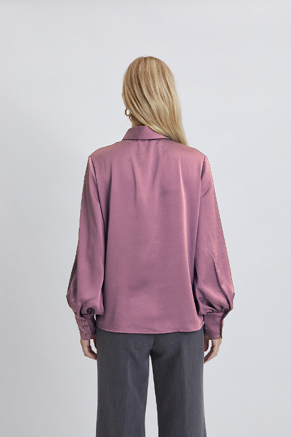 Camisa de satén con textura, cierre mediante botonadura oculta por tapeta y pinzas de pecho. Puños con cierre de botones.