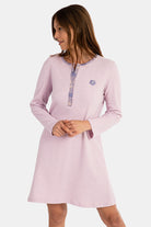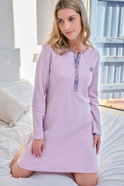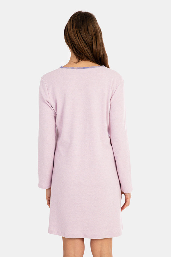 Camisón corto de manga larga en tejido listado. Con cuello de tapeta en tejido de cuadros con botones. Detalle de aplique en el pecho.