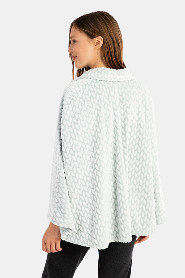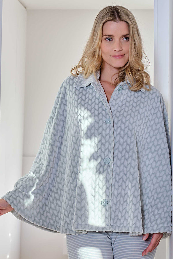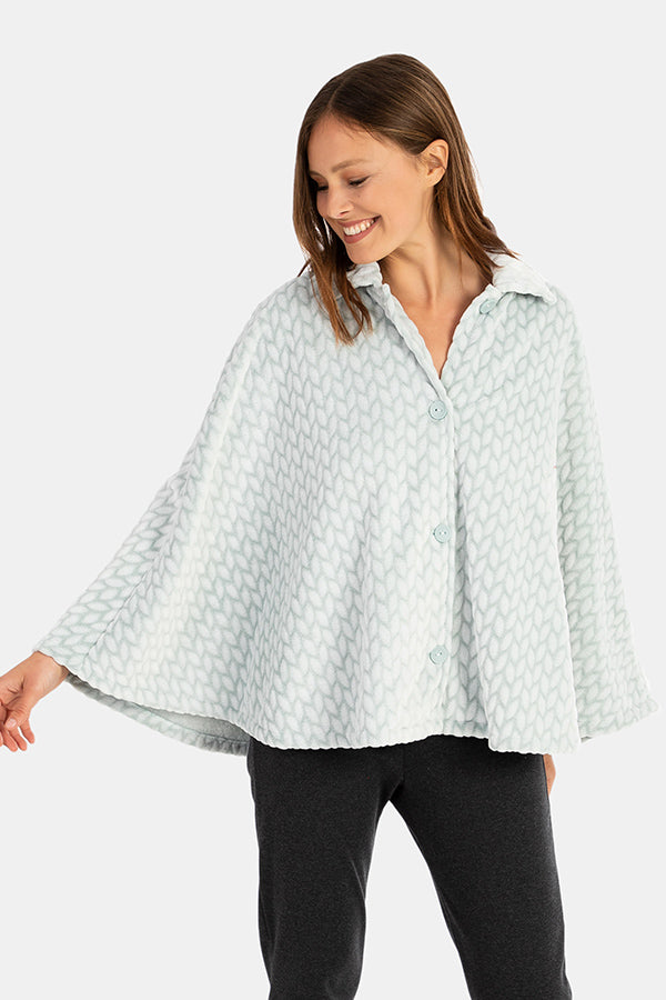 Capa de mujer corta con cierre de botones en tejido tipo polar muy suave con dibujo de espiga grabado con efecto 'burn'. Cuello tipo solapa.