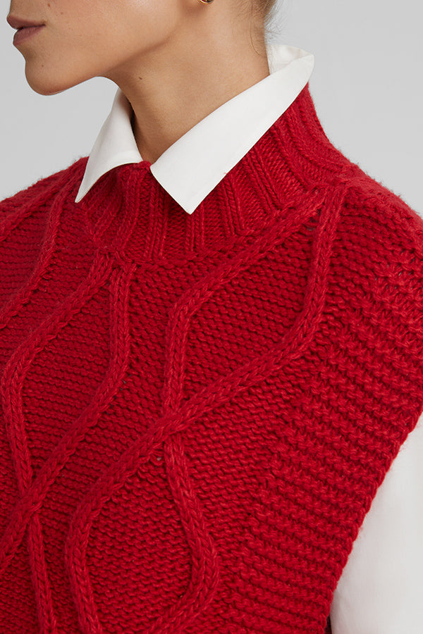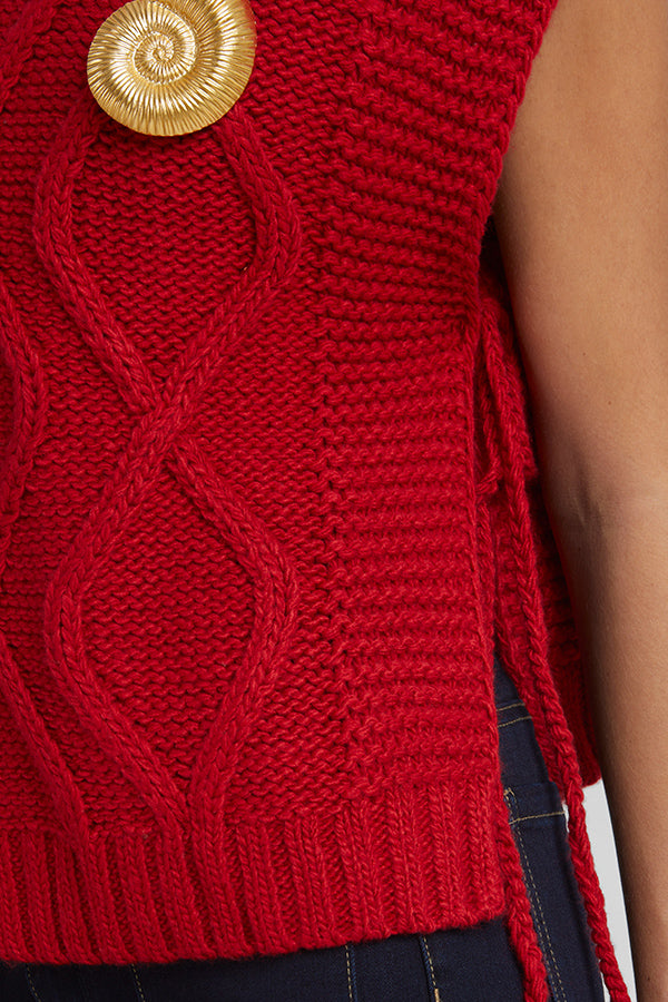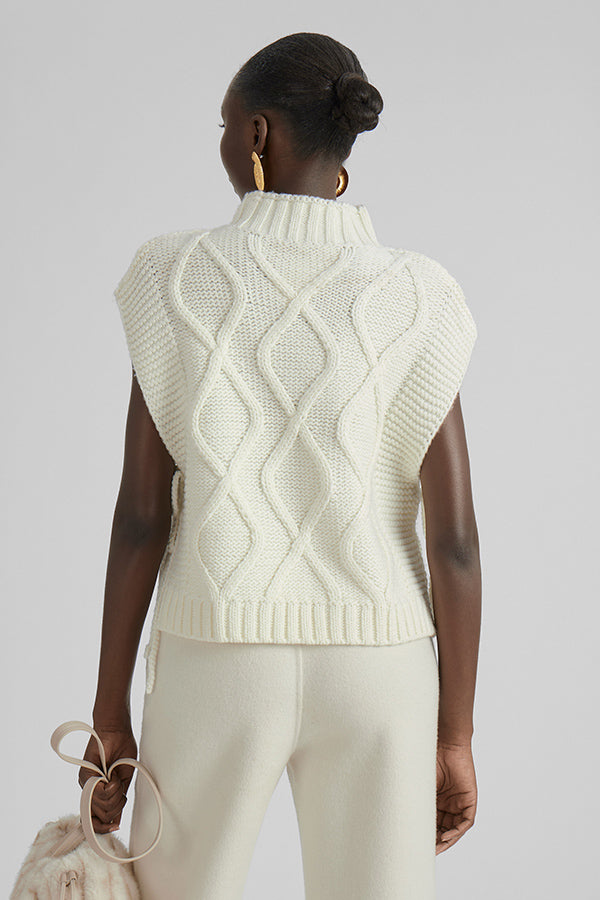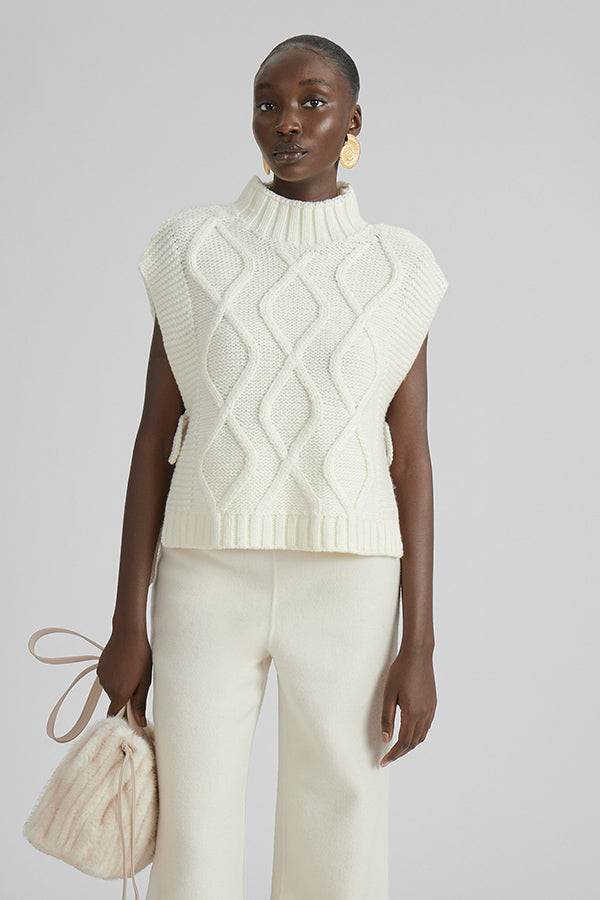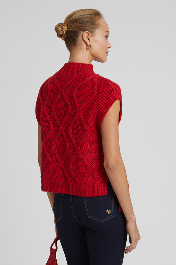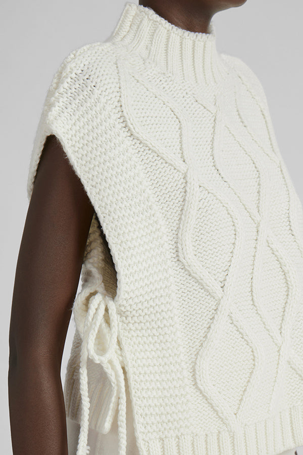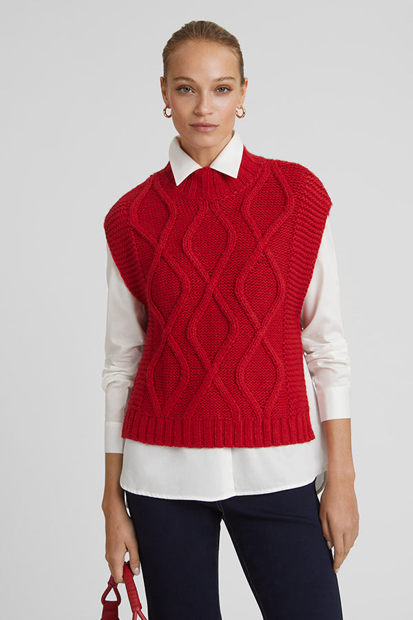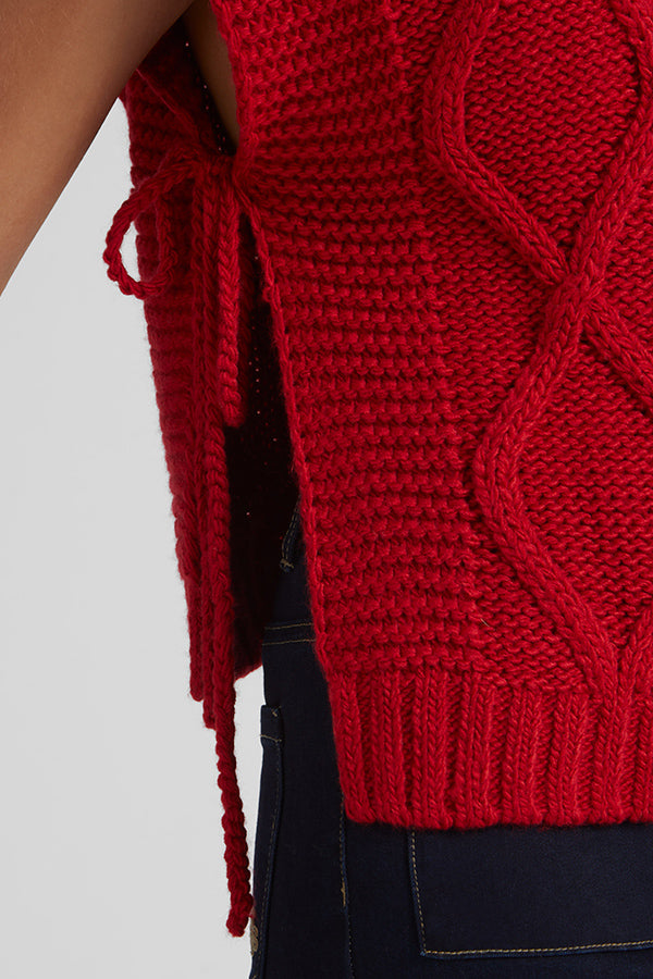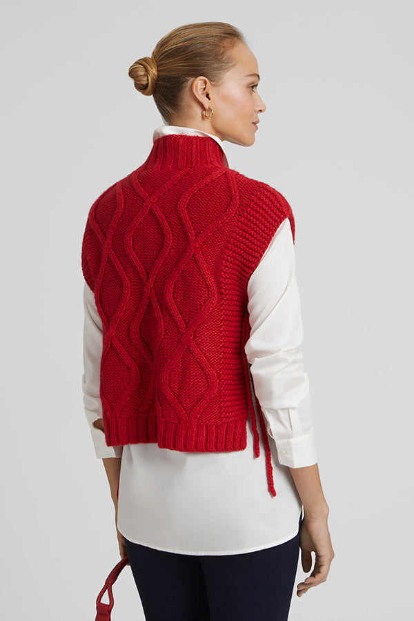 Chaleco realizado en un punto grueso con dibujos de trenzas. Cuello alto acanalado. Cintas de punto para ajustar los laterales.