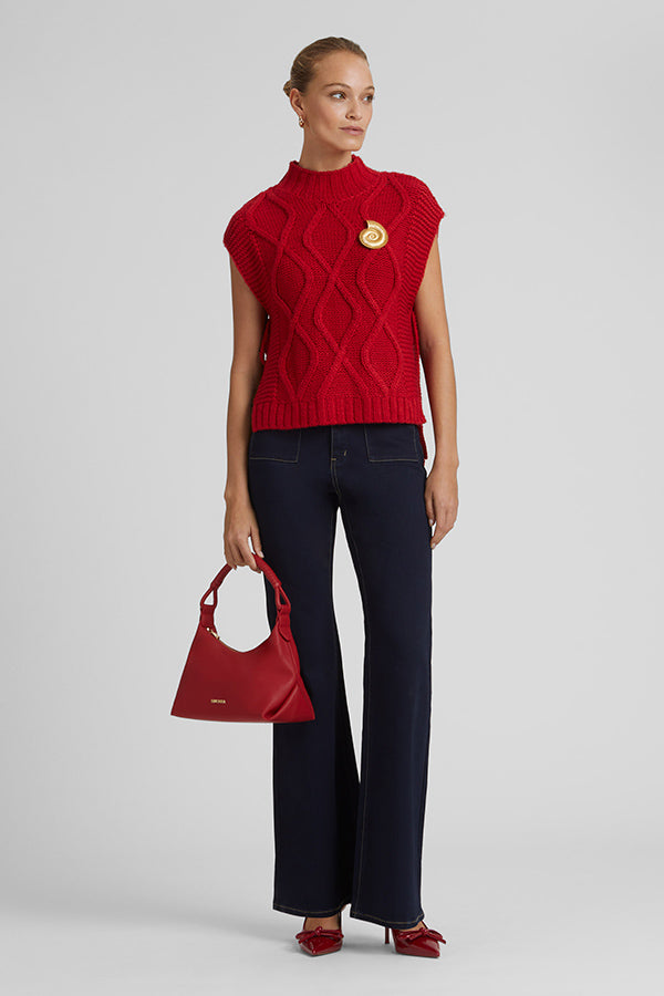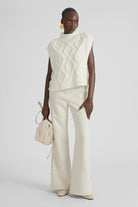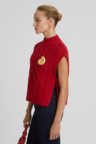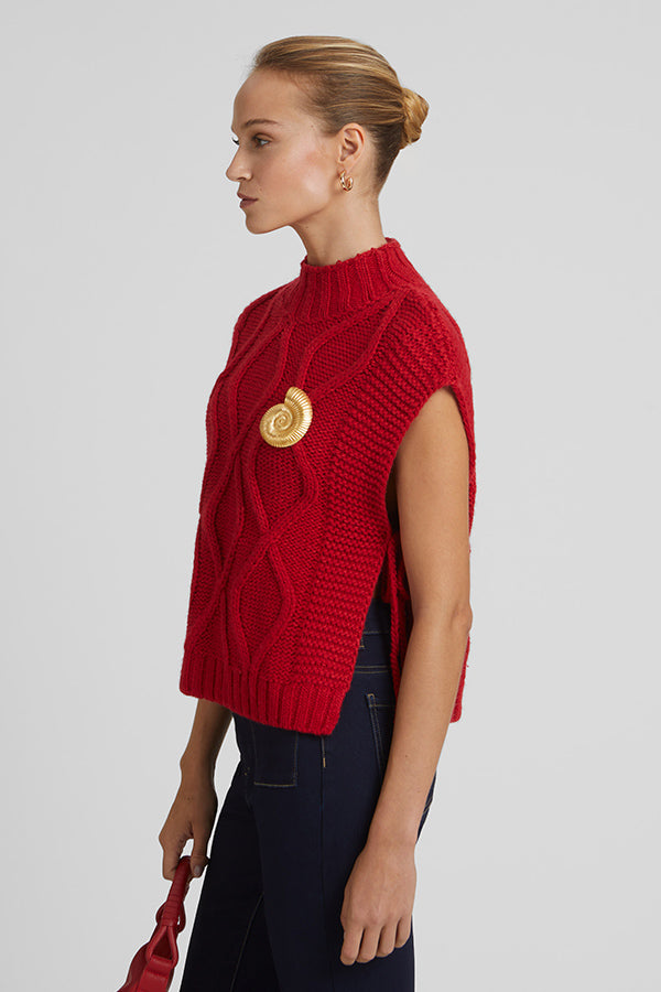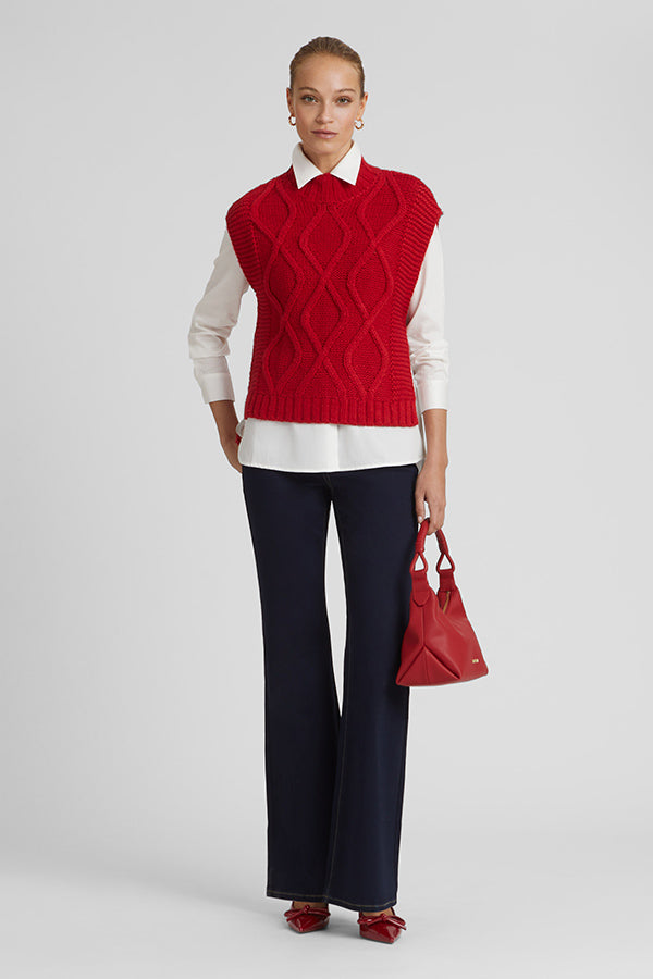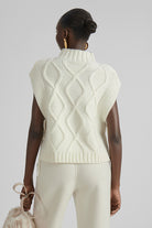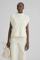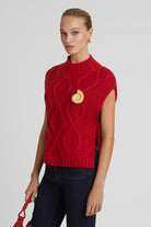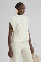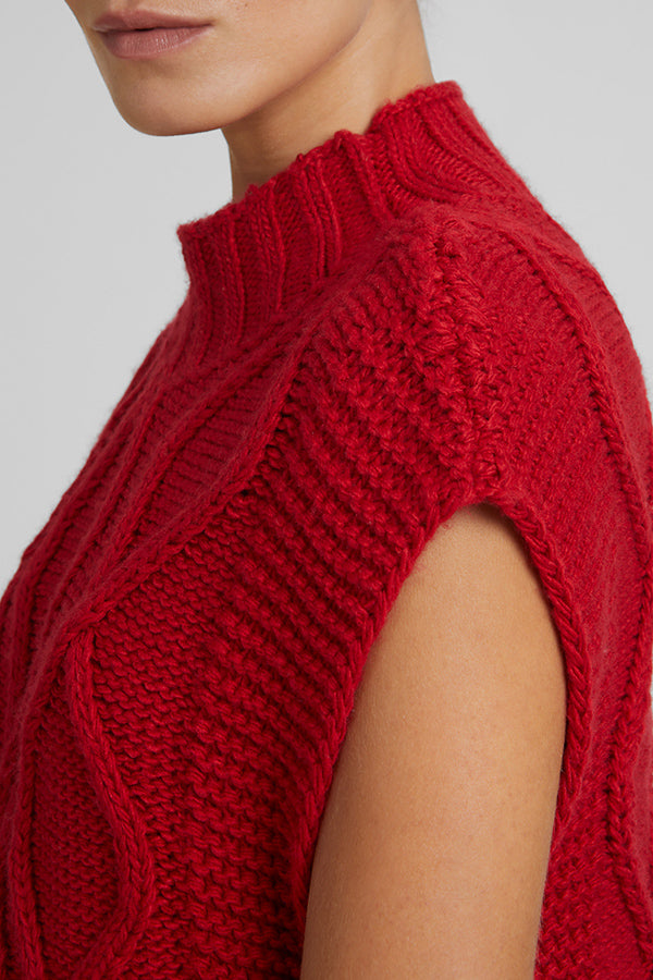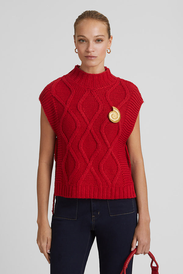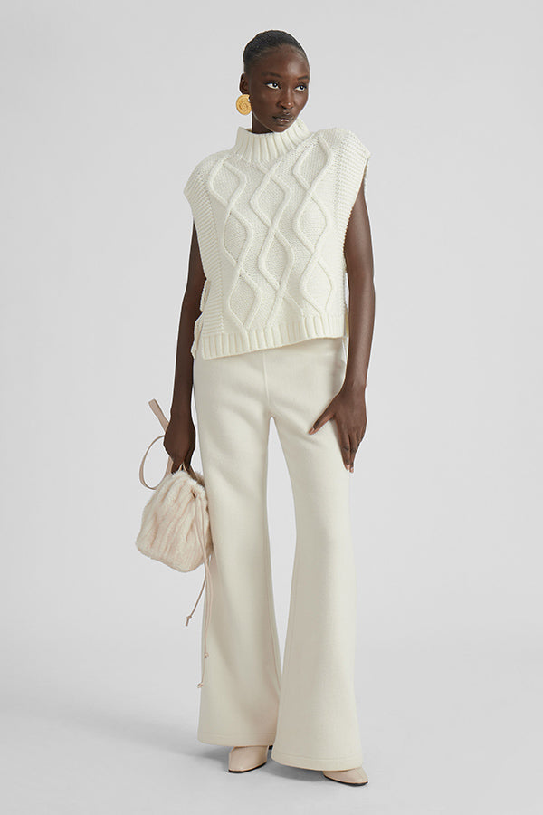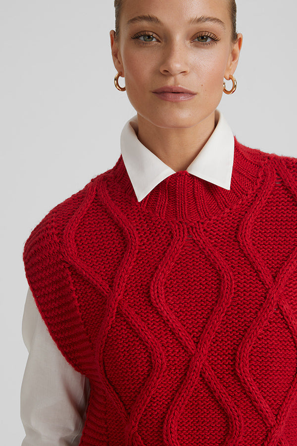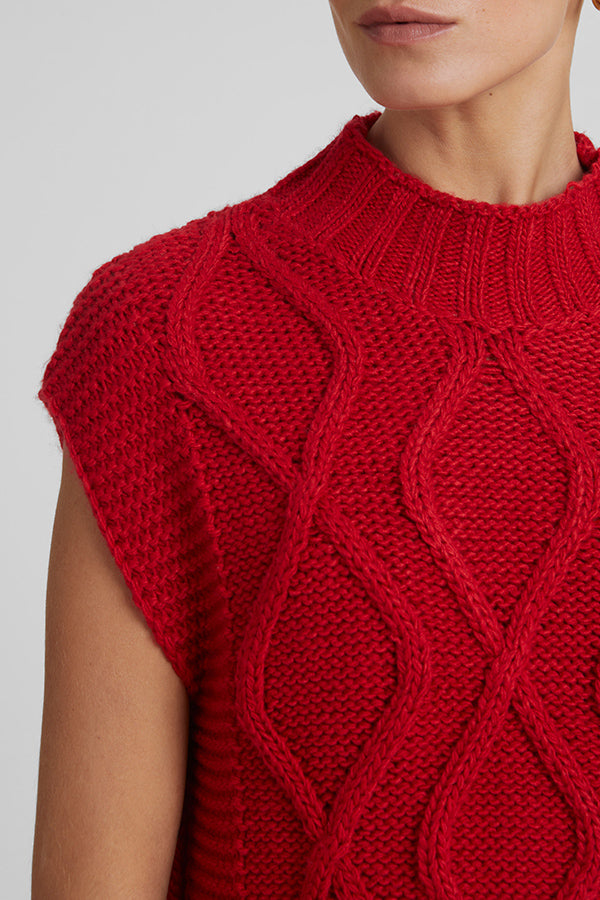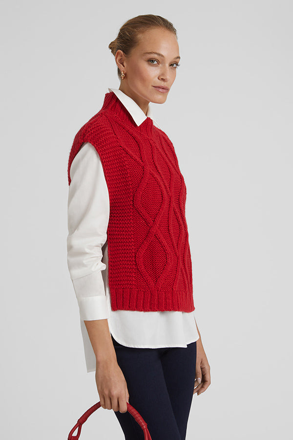 Chaleco realizado en un punto grueso con dibujos de trenzas. Cuello alto acanalado. Cintas de punto para ajustar los laterales.