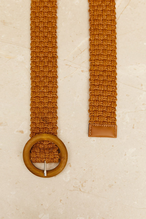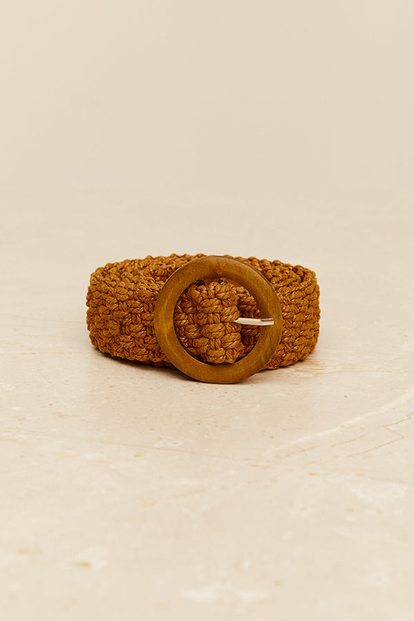 Cinturón de cuerda entrelazada. Cierre mediante hebilla de madera redonda y pasador de piel.