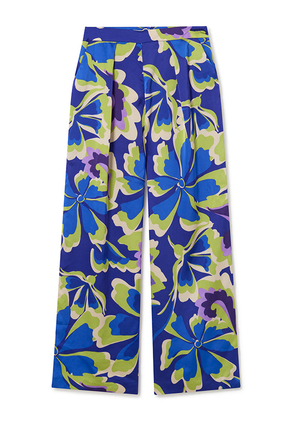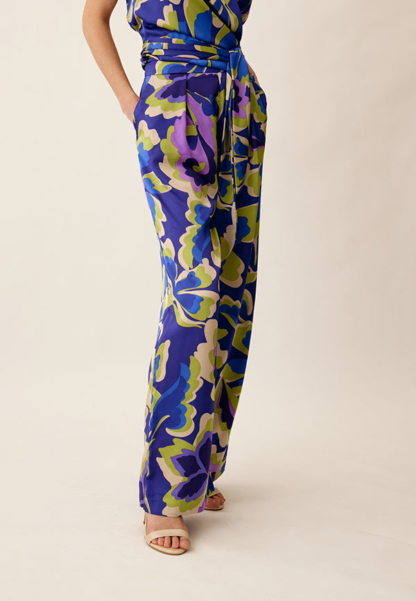 Pantalón palazzo de raso estampado con pinzas, cinturilla y cremallera invisible en el lateral.