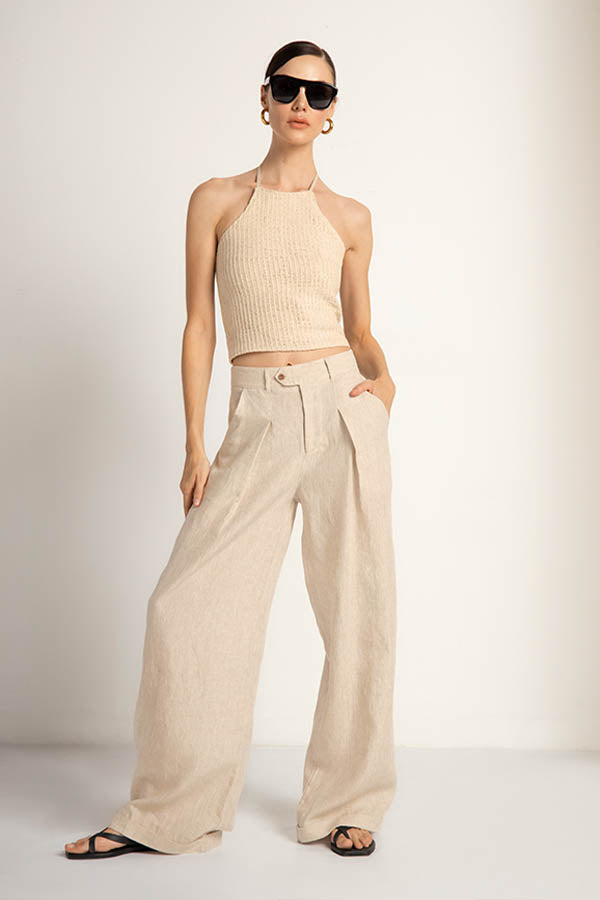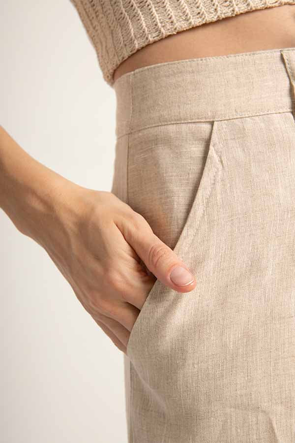 Pantalón de corte recto con detalles plisados y bolsillos laterales.