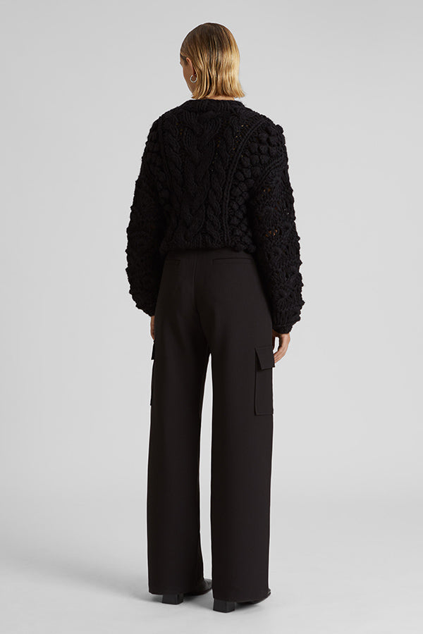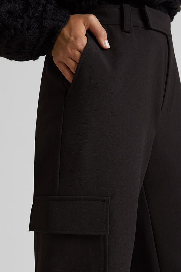 Pantalón largo de tiro alto. Cinturilla con trabillas, cierre mediante cremallera oculta por tapeta y botón interior. Bolsillo francés en laterales y de plastón con cartera en perneras. Bolsillo de vivo en parte trasera.