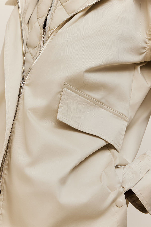 Parka corta con capucha ajustable. Cierre central mediante cremallera y snaps ocultos bajo tapeta. Mangas con puño y cierre de snap. Dos bolsillos con solapa. Chaleco interior acolchado extraíble mediante botones a presión.