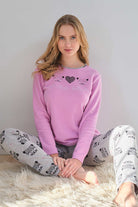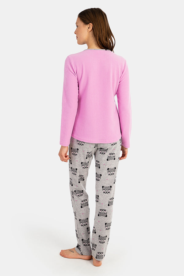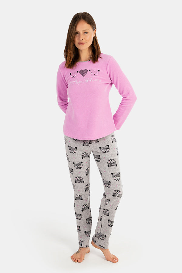 Pijama de mujer, compuesto por camiseta en tundosado con grafico estampado en el delantero, manga larga y cuello redondo. Pantalón largo en Jacquard punto milano con dibujo tejido all over