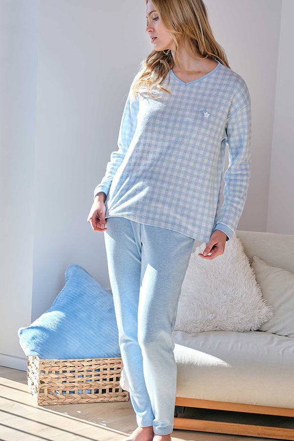 Pijama de mujer, compuesto por camiseta en tejido Jacquard Vichy, manga larga, cuello y puños en contraste. Pantalón largo en tejido Interlock y goma en cintura